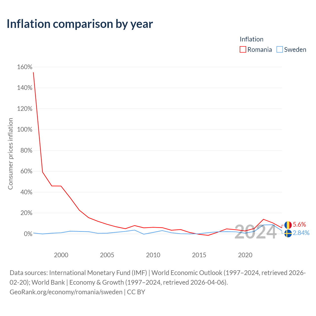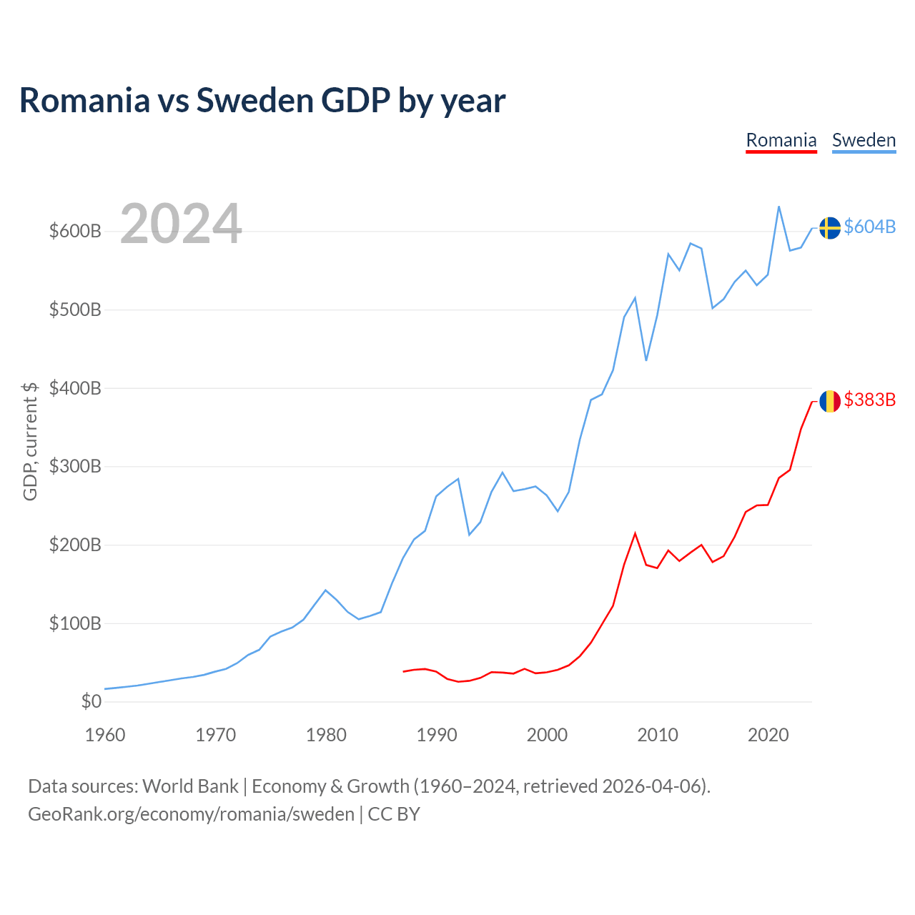 Romania has a GDP of $383B compared to $604B for Sweden, ranking 42/197 and 26/197 by economy size, respectively.