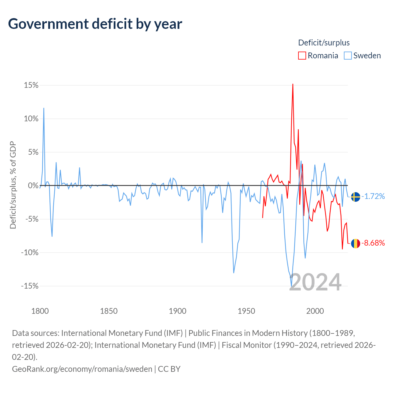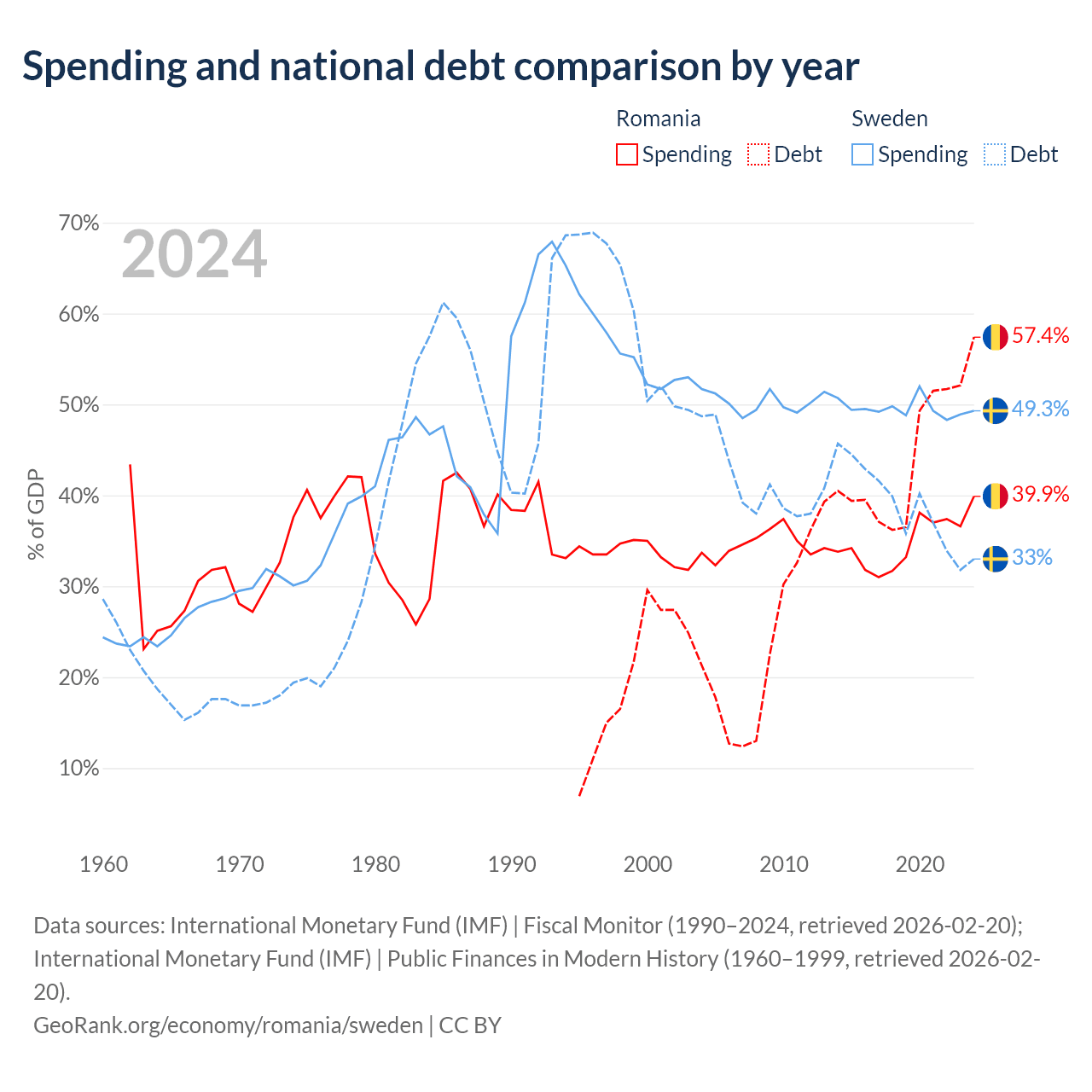 Romania has $220B in government debt (57.4% of GDP), compared to $199B (33% of GDP) in Sweden.