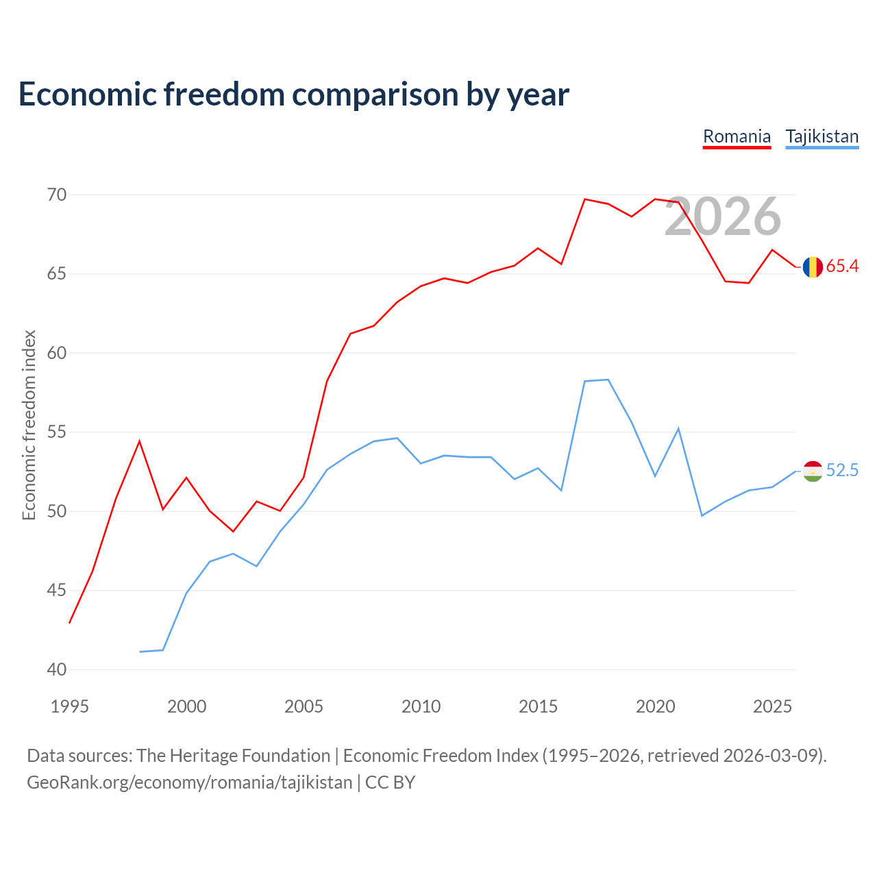 The Economic Freedom Index for Romania is 65.4, ranking 64/197, compared to 52.5 for Tajikistan, ranking 147/197. The chart above displays a comparison of annual changes in economic freedom indexes.