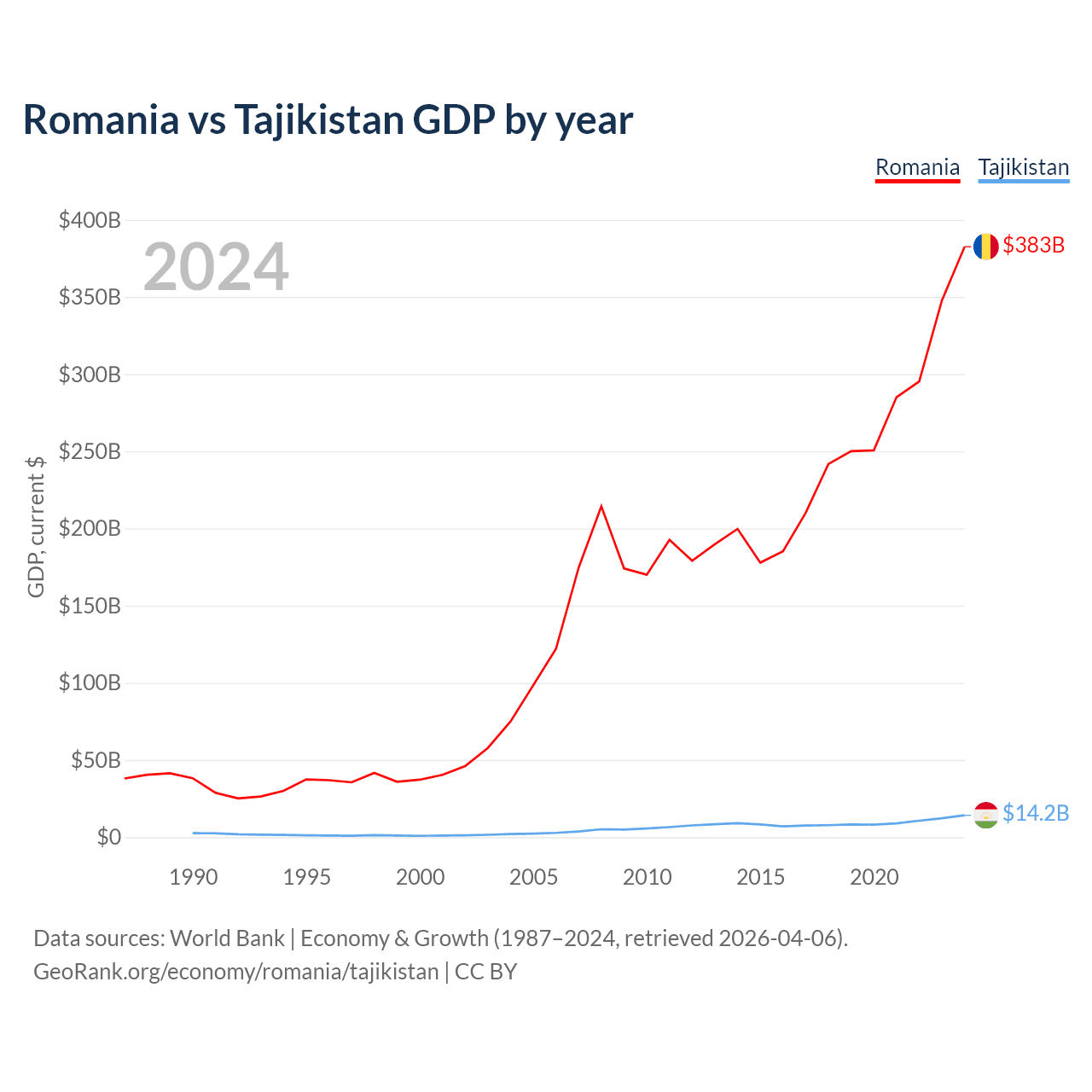 Romania has a GDP of $383B compared to $14.2B for Tajikistan, ranking 42/197 and 145/197 by economy size, respectively.