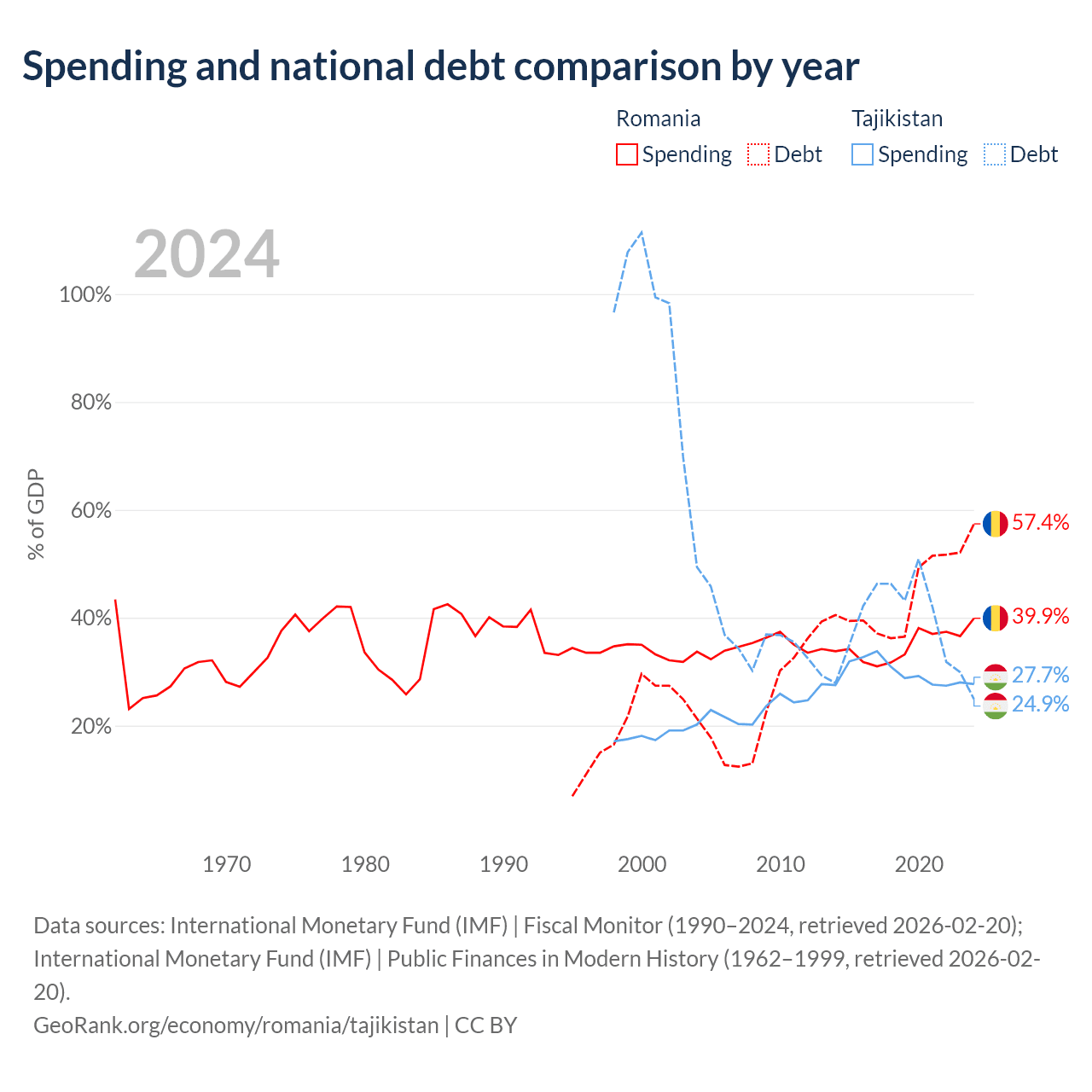 Romania has $220B in government debt (57.4% of GDP), compared to $3.54B (24.9% of GDP) in Tajikistan.