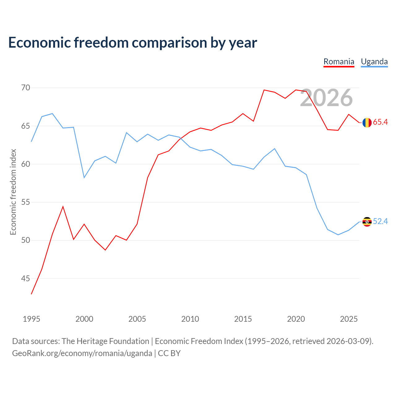 The Economic Freedom Index for Romania is 65.4, ranking 64/197, compared to 52.4 for Uganda, ranking 149/197. The chart above displays a comparison of annual changes in economic freedom indexes.