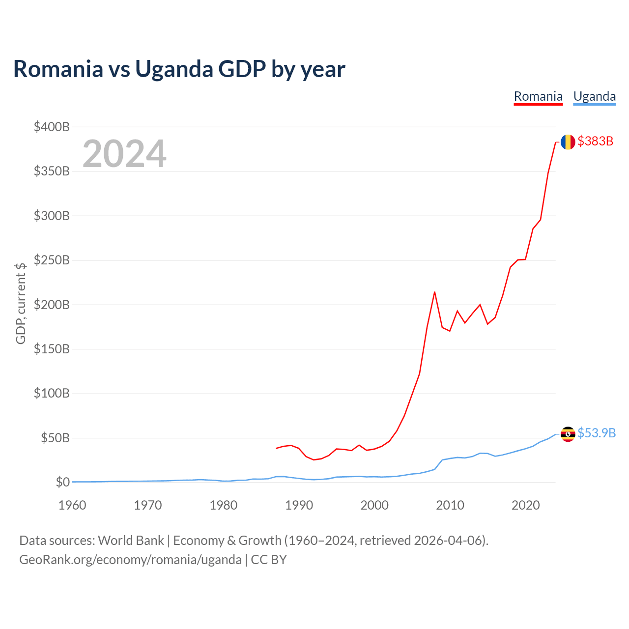 Romania vs Uganda GDP by year