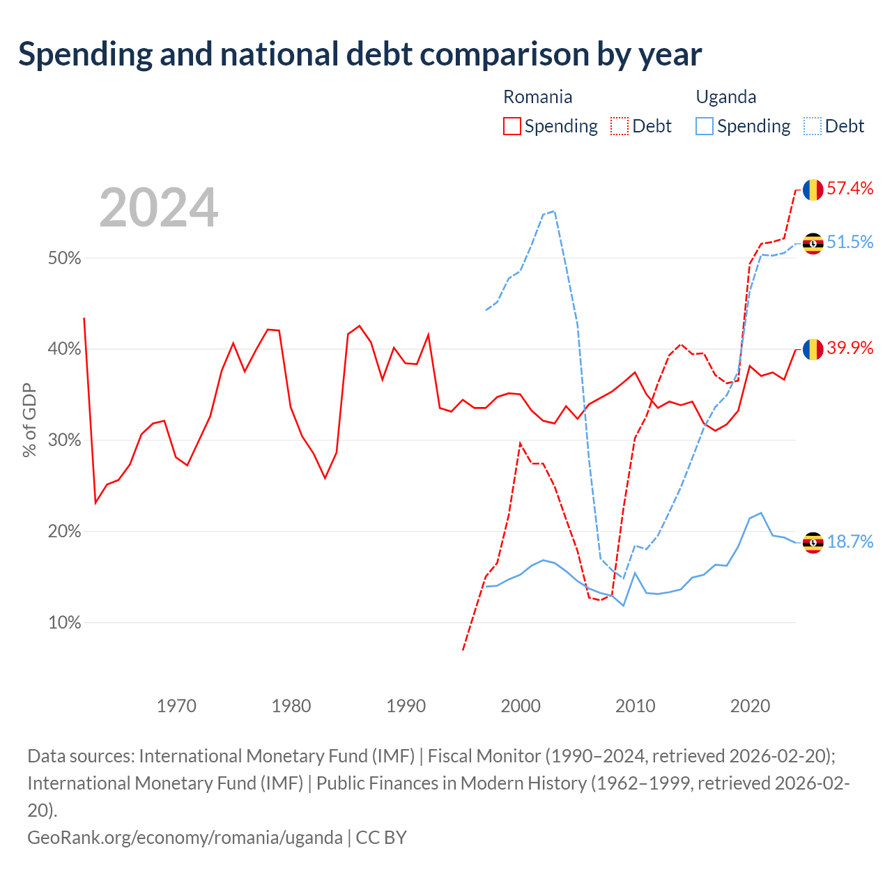 Romania has $220B in government debt (57.4% of GDP), compared to $27.8B (51.5% of GDP) in Uganda.