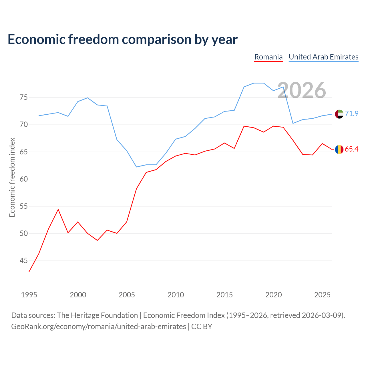 The Economic Freedom Index for Romania is 65.4, ranking 64/197, compared to 71.9 for the United Arab Emirates, ranking 29/197. The chart above displays a comparison of annual changes in economic freedom indexes.