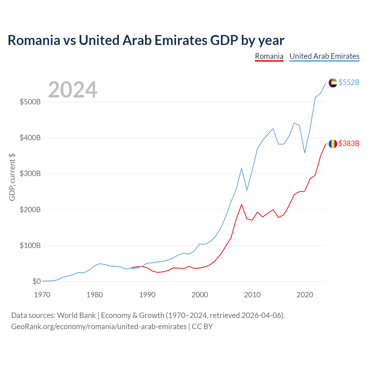 Romania has a GDP of $383B compared to $552B for the United Arab Emirates, ranking 42/197 and 27/197 by economy size, respectively.