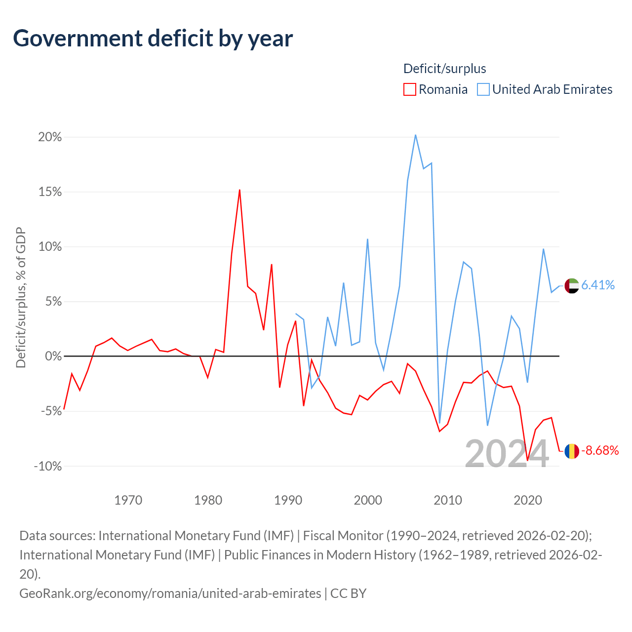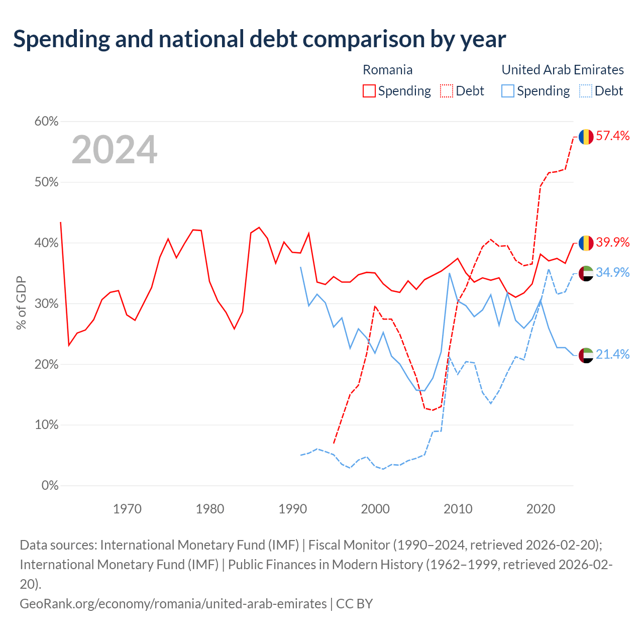 Romania has $220B in government debt (57.4% of GDP), compared to $193B (34.9% of GDP) in the United Arab Emirates.