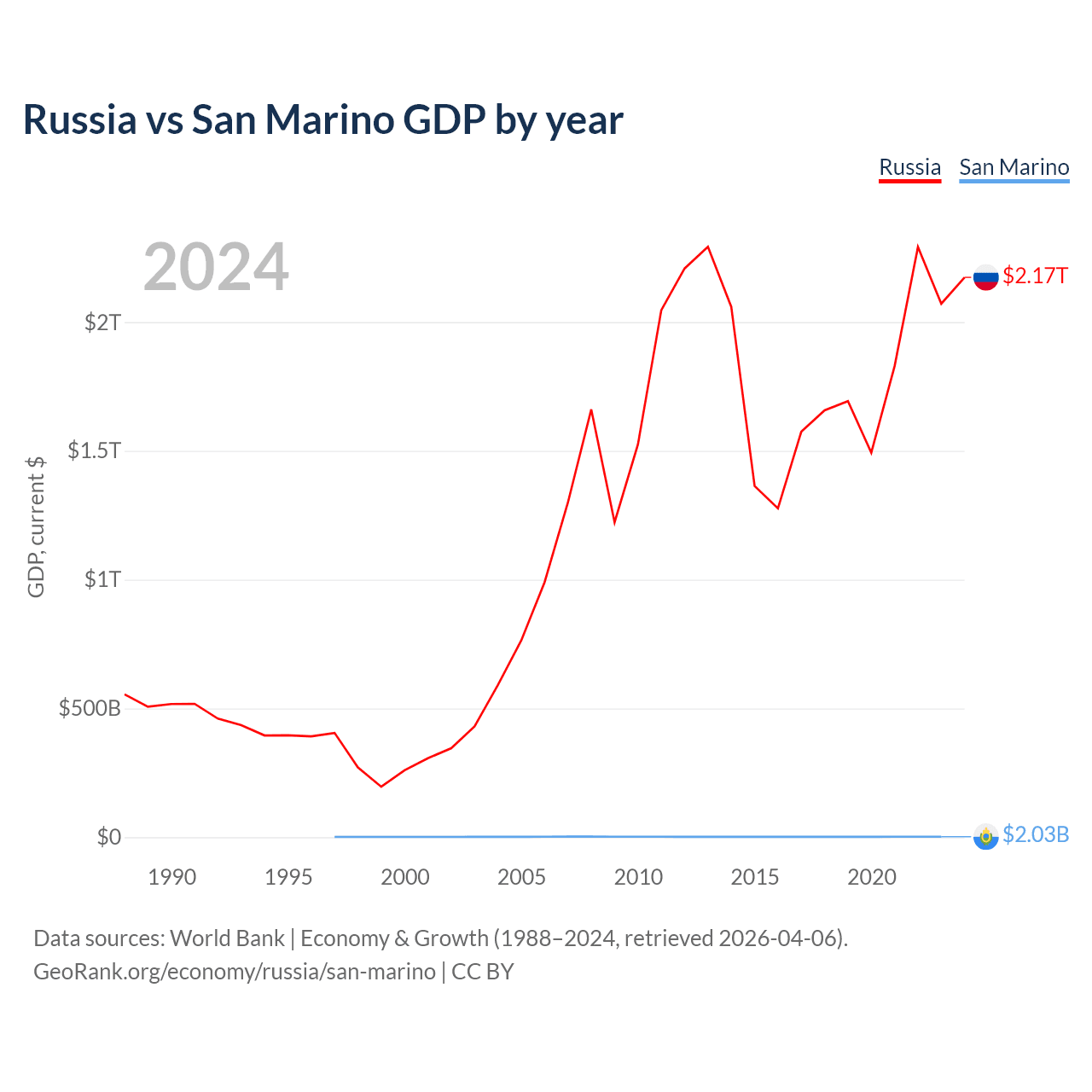 Russia has a GDP of $2.17T compared to $2.03B for San Marino, ranking 11/197 and 180/197 by economy size, respectively.