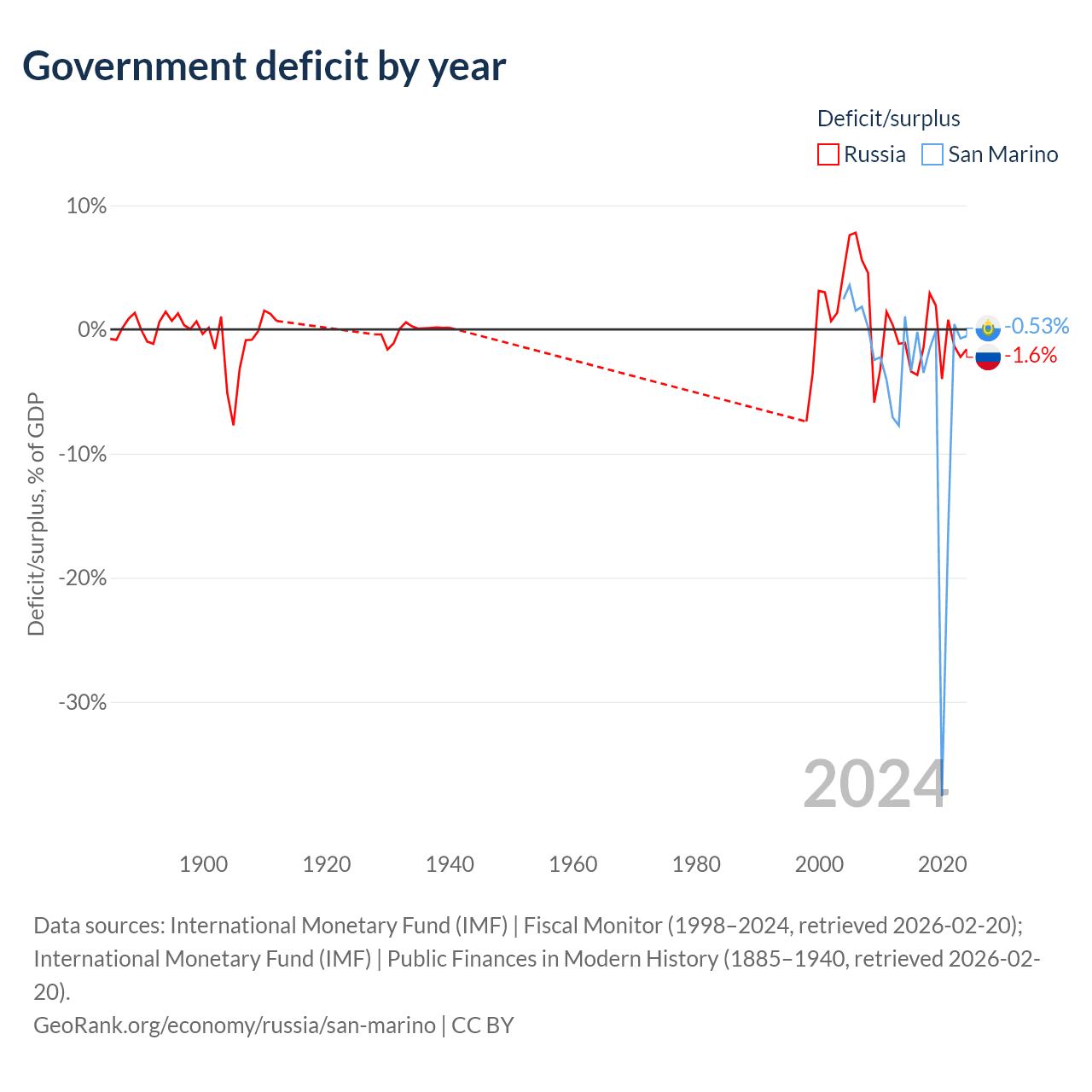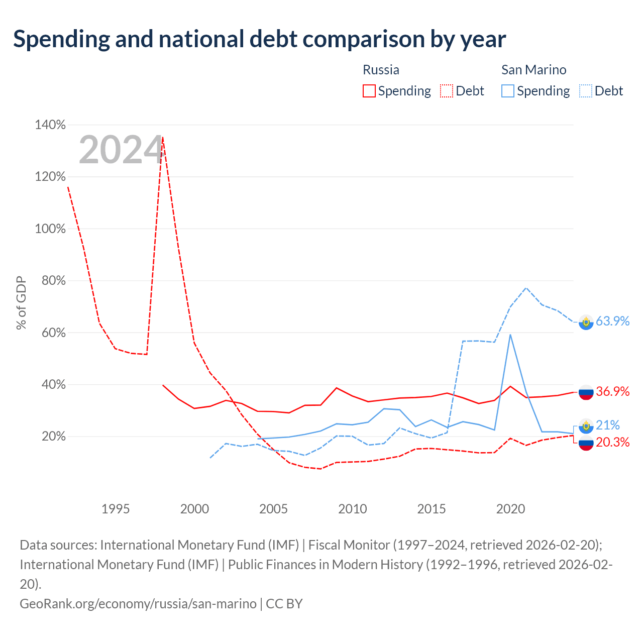 Russia has $440B in government debt (20.3% of GDP), compared to $1.39B (63.9% of GDP) in San Marino.