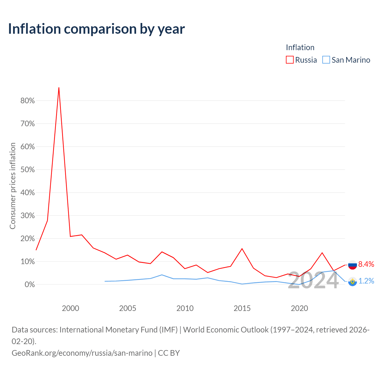 Russia's GDP per capita is $15,145, ranking 68/197, compared to $59,880 in San Marino, ranking 15/197. Adjusted for purchasing power (GDP per capita PPP), Russia ranks 50th at $47,405, while San Marino ranks 17th at $78,745.
