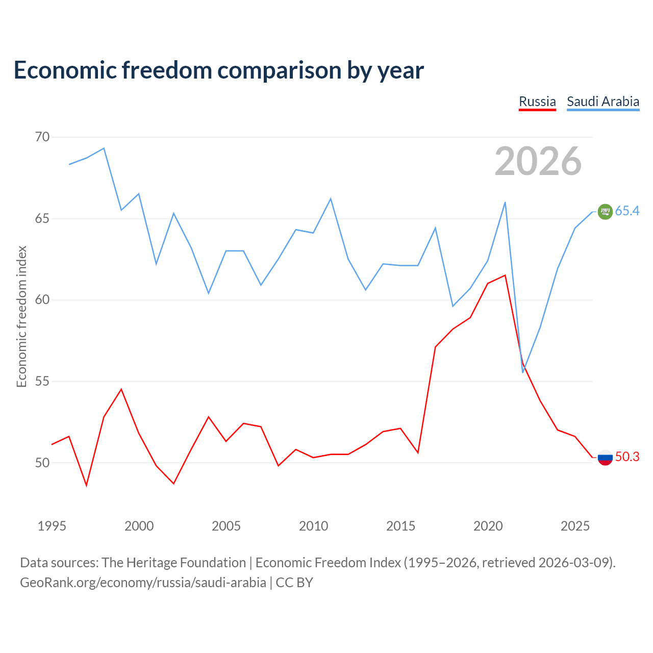 The Economic Freedom Index for Russia is 50.3, ranking 161/197, compared to 65.4 for Saudi Arabia, ranking 65/197. The chart above displays a comparison of annual changes in economic freedom indexes.