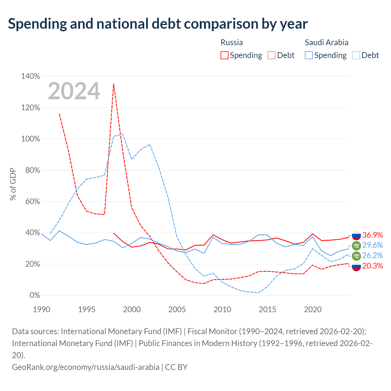 Russia has $440B in government debt (20.3% of GDP), compared to $324B (26.2% of GDP) in Saudi Arabia.