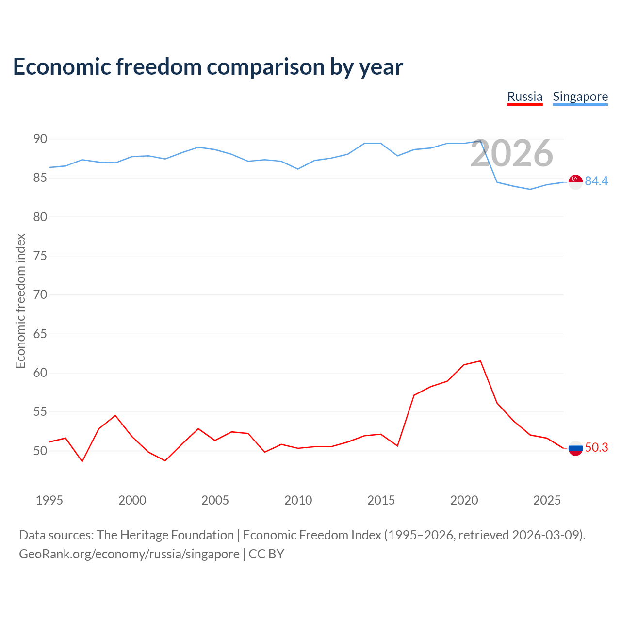 Data sources: The Heritage Foundation | Economic Freedom Index (1995–2026, retrieved 2026-03-09).