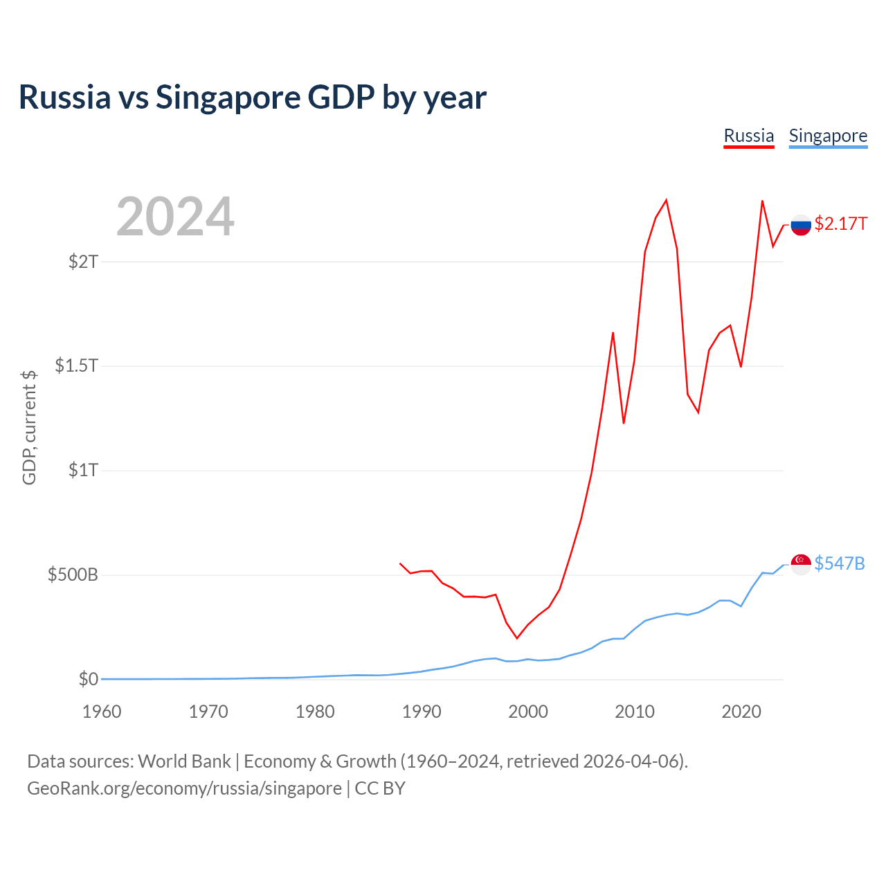 Russia vs Singapore GDP by year