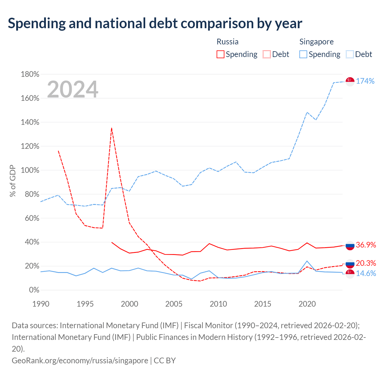 Russia has $440B in government debt (20.3% of GDP), compared to $950B (173.5% of GDP) in Singapore.