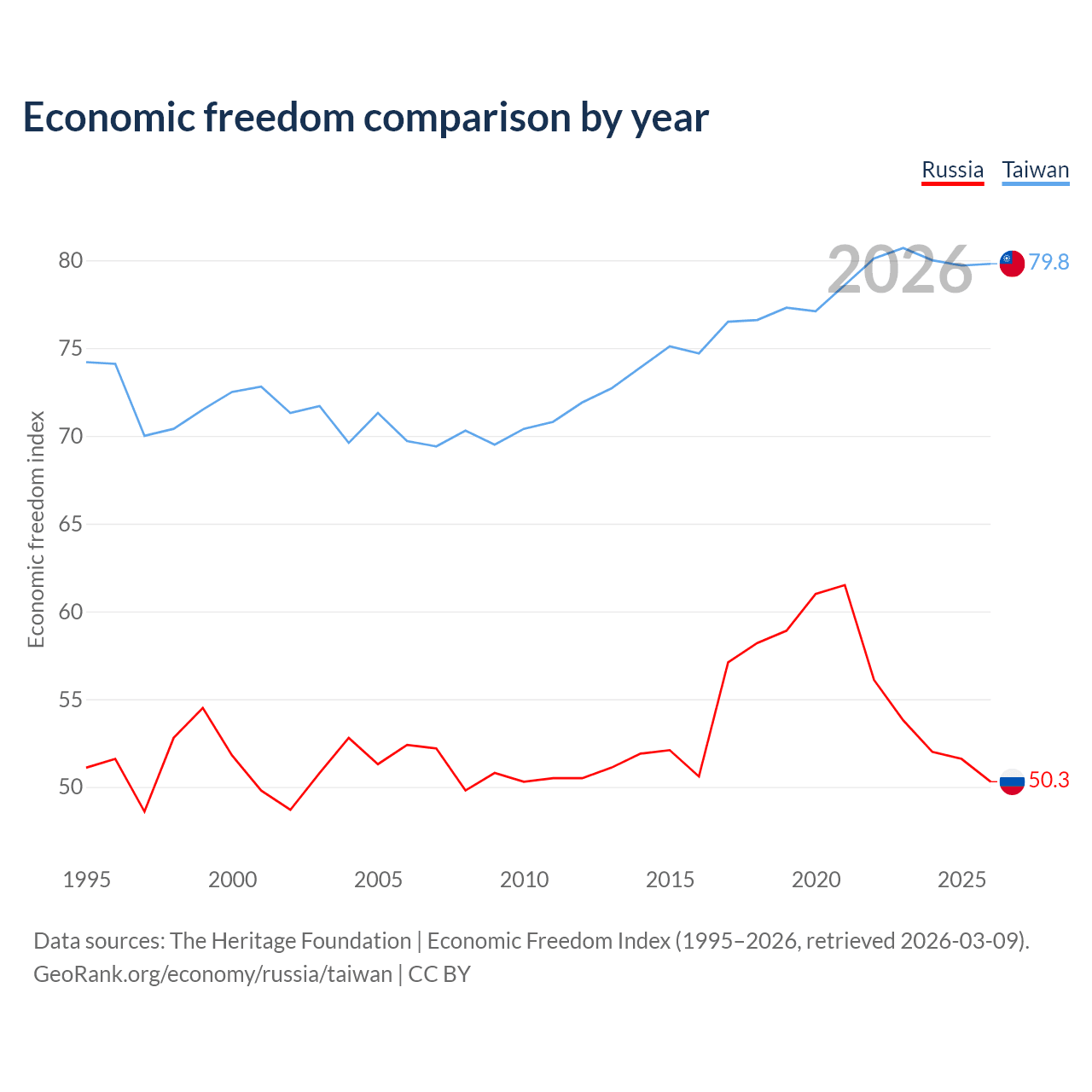 The Economic Freedom Index for Russia is 50.3, ranking 161/197, compared to 79.8 for Taiwan, ranking 6/197. The chart above displays a comparison of annual changes in economic freedom indexes.