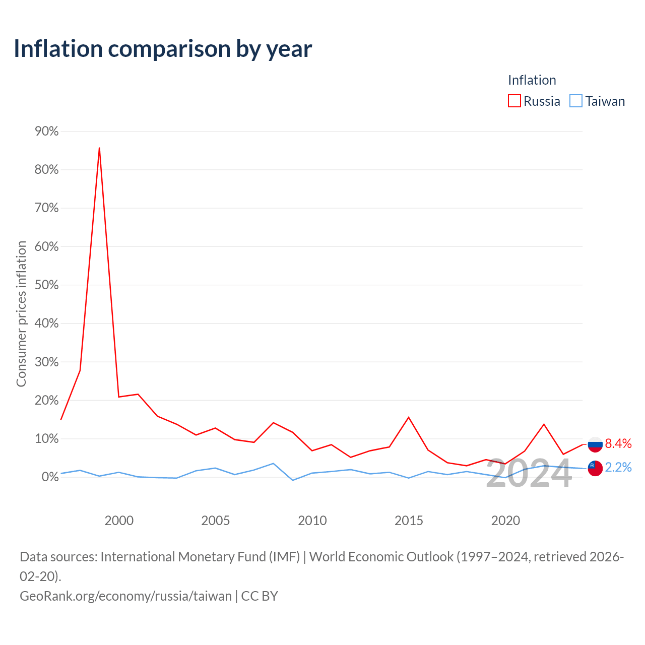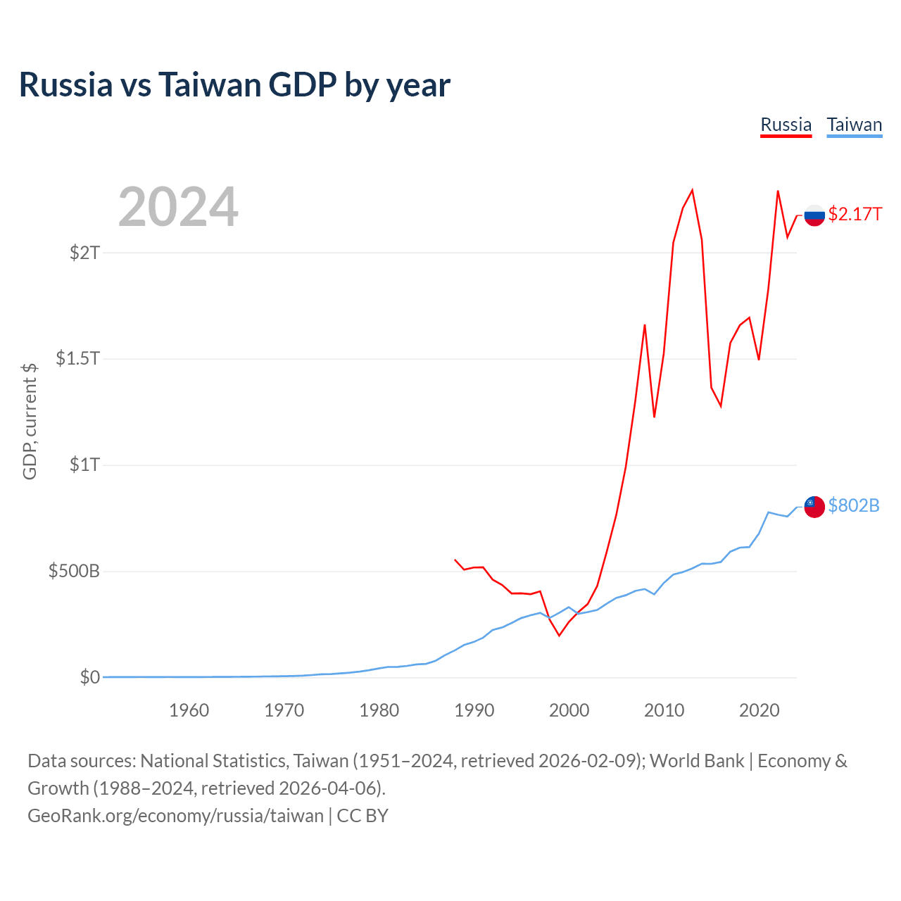 Russia has a GDP of $2.17T compared to $802B for Taiwan, ranking 11/197 and 22/197 by economy size, respectively.