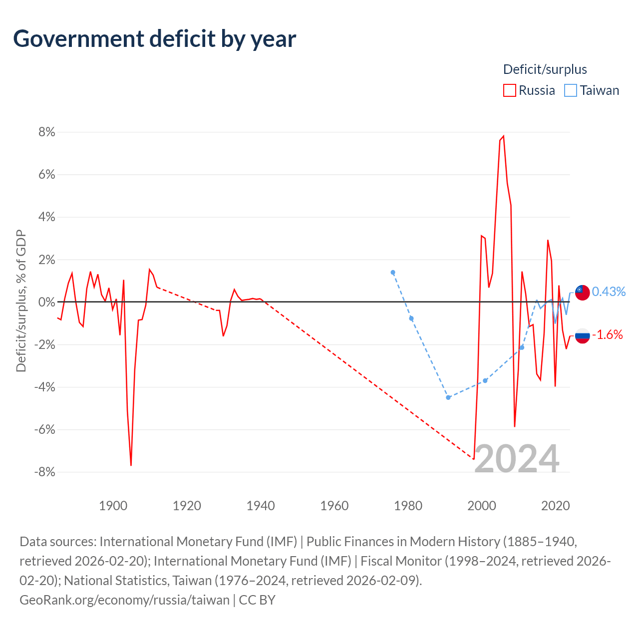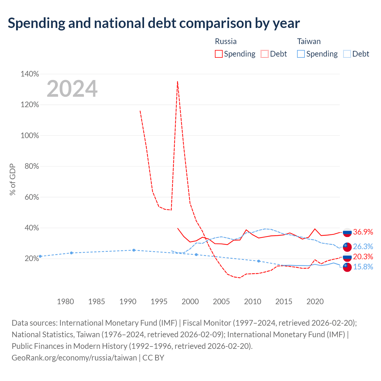 Russia has $440B in government debt (20.3% of GDP), compared to $211B (26.3% of GDP) in Taiwan.