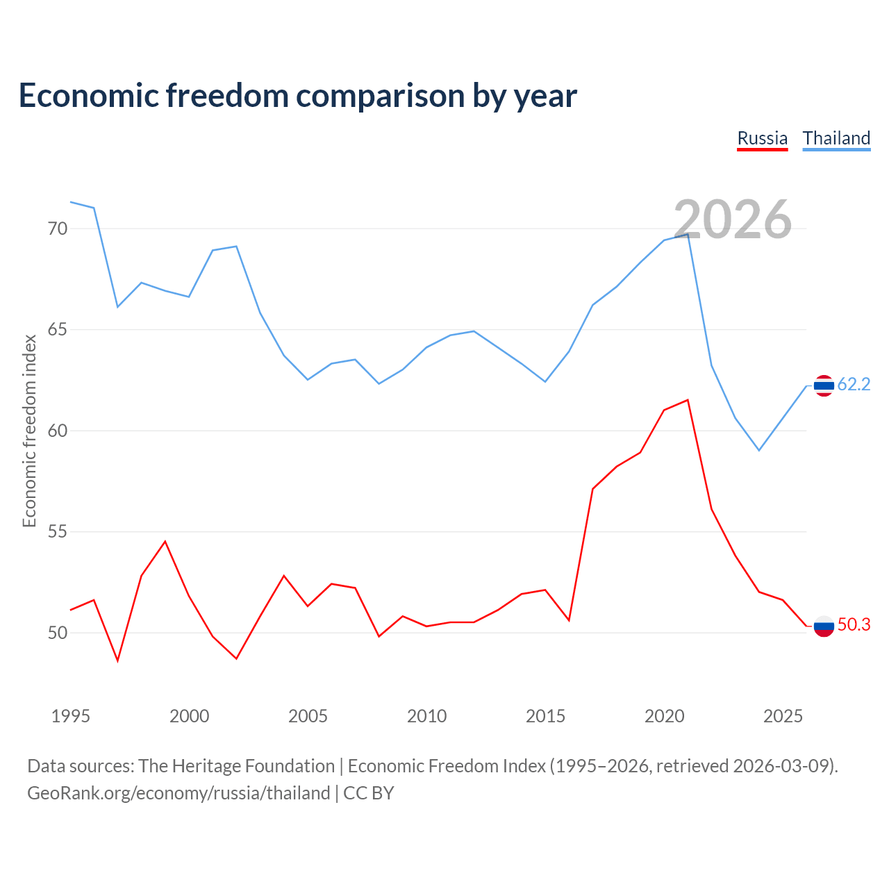 The Economic Freedom Index for Russia is 50.3, ranking 161/197, compared to 62.2 for Thailand, ranking 88/197. The chart above displays a comparison of annual changes in economic freedom indexes.