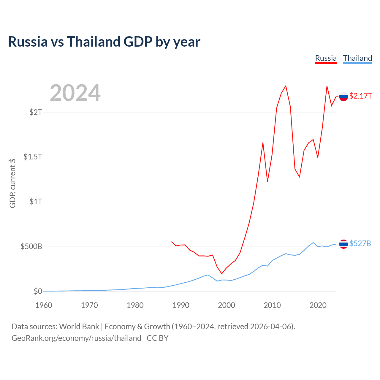 Russia vs Thailand GDP by year