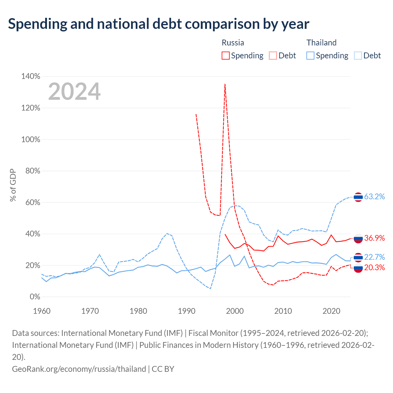 Russia has $440B in government debt (20.3% of GDP), compared to $333B (63.2% of GDP) in Thailand.