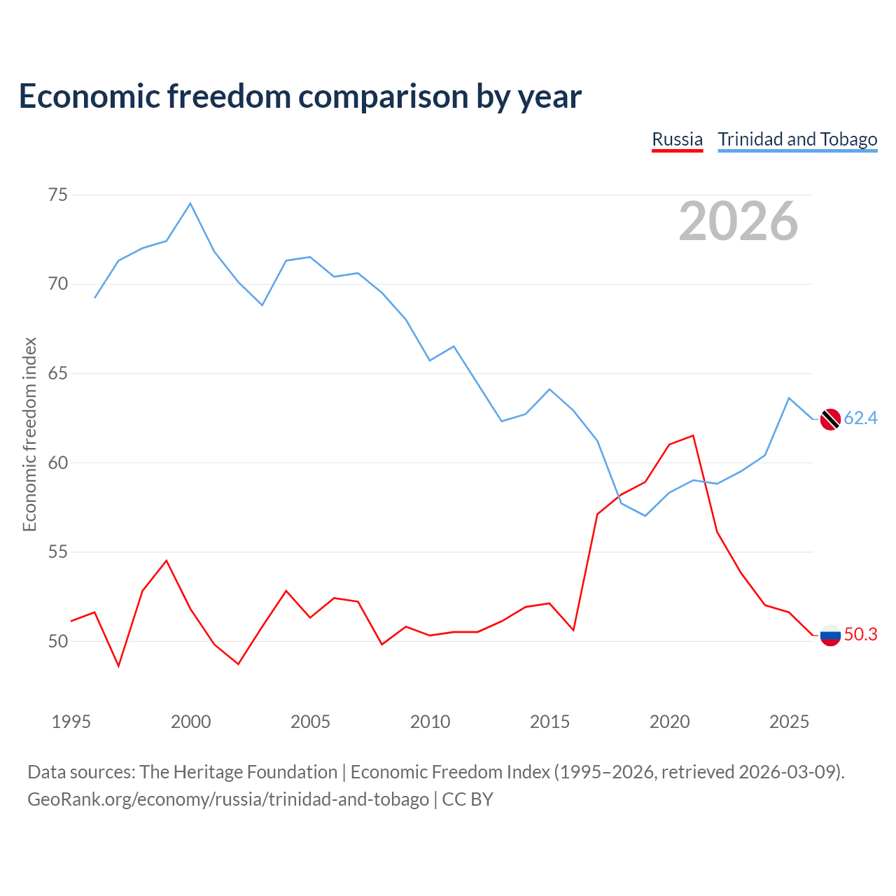 The Economic Freedom Index for Russia is 50.3, ranking 161/197, compared to 62.4 for Trinidad and Tobago, ranking 87/197. The chart above displays a comparison of annual changes in economic freedom indexes.