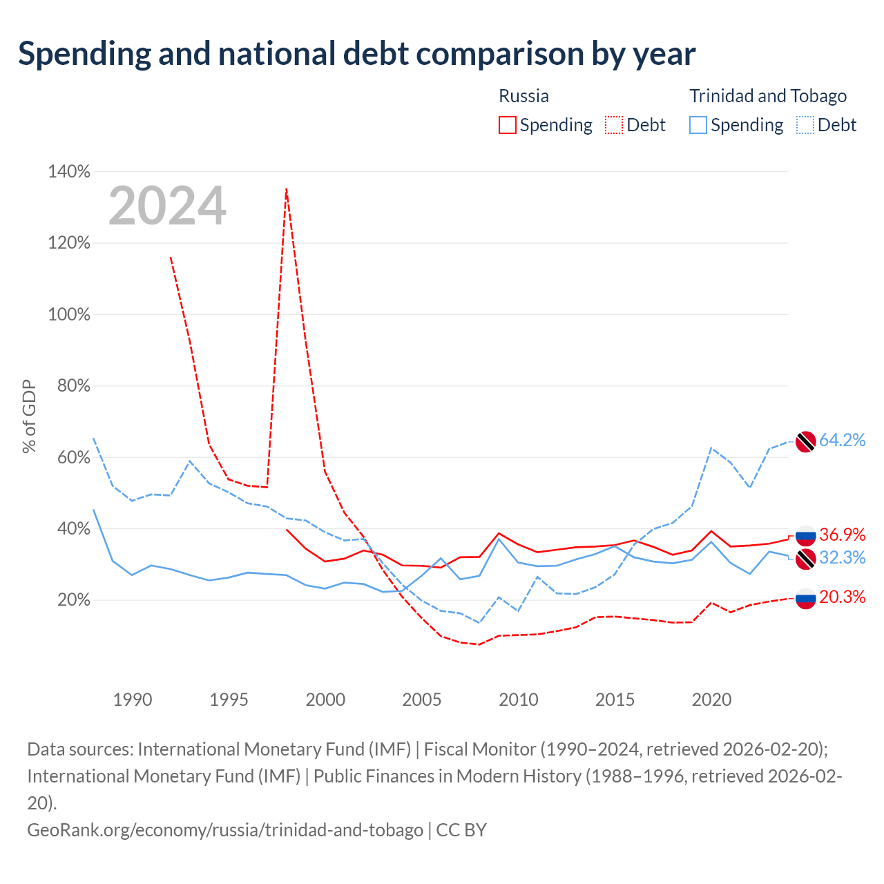 Russia has $440B in government debt (20.3% of GDP), compared to $16.5B (64.2% of GDP) in Trinidad and Tobago.