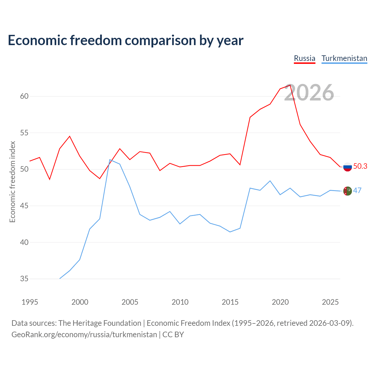 The Economic Freedom Index for Russia is 50.3, ranking 161/197, compared to 47 for Turkmenistan, ranking 177/197. The chart above displays a comparison of annual changes in economic freedom indexes.