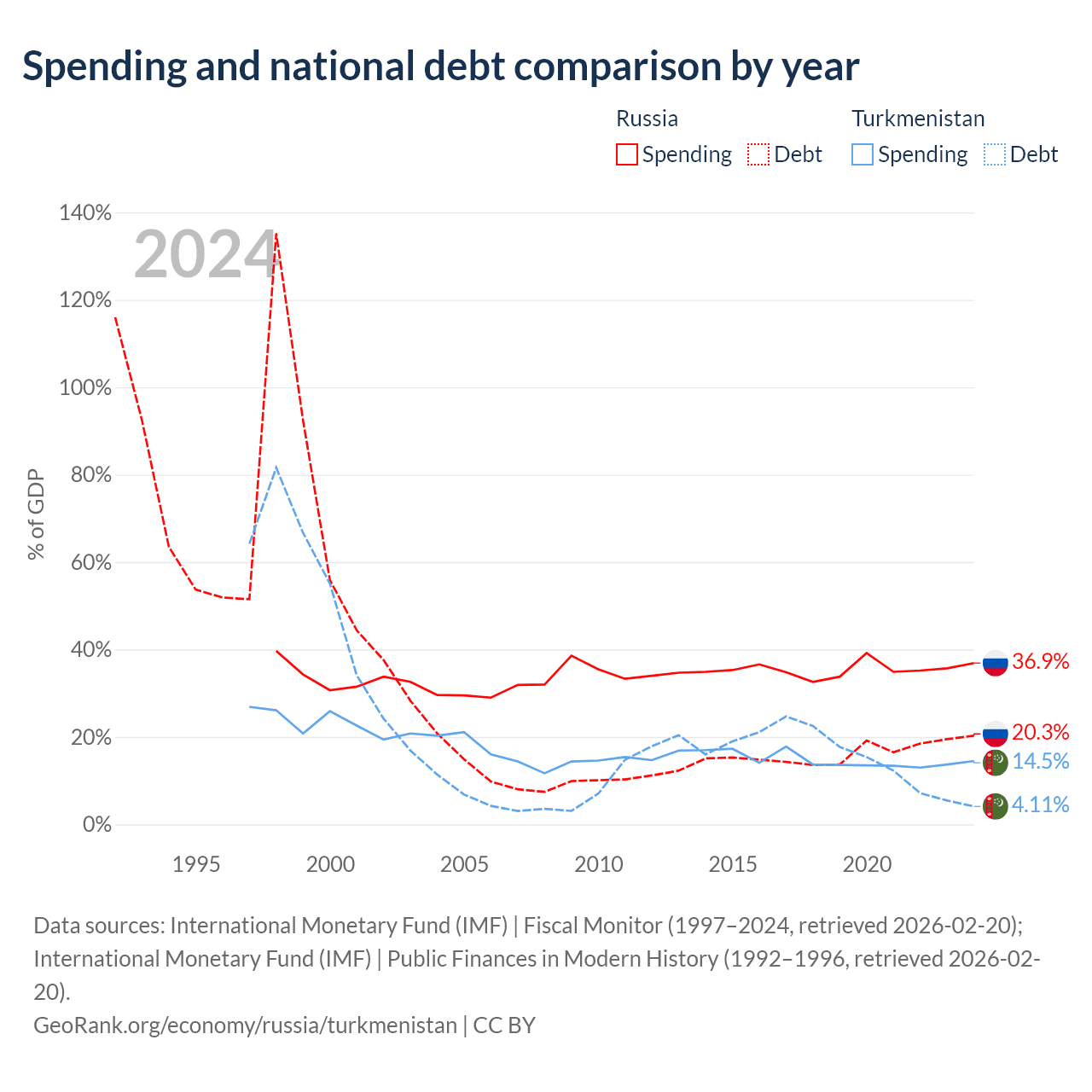 Russia has $440B in government debt (20.3% of GDP), compared to $2.11B (4.11% of GDP) in Turkmenistan.
