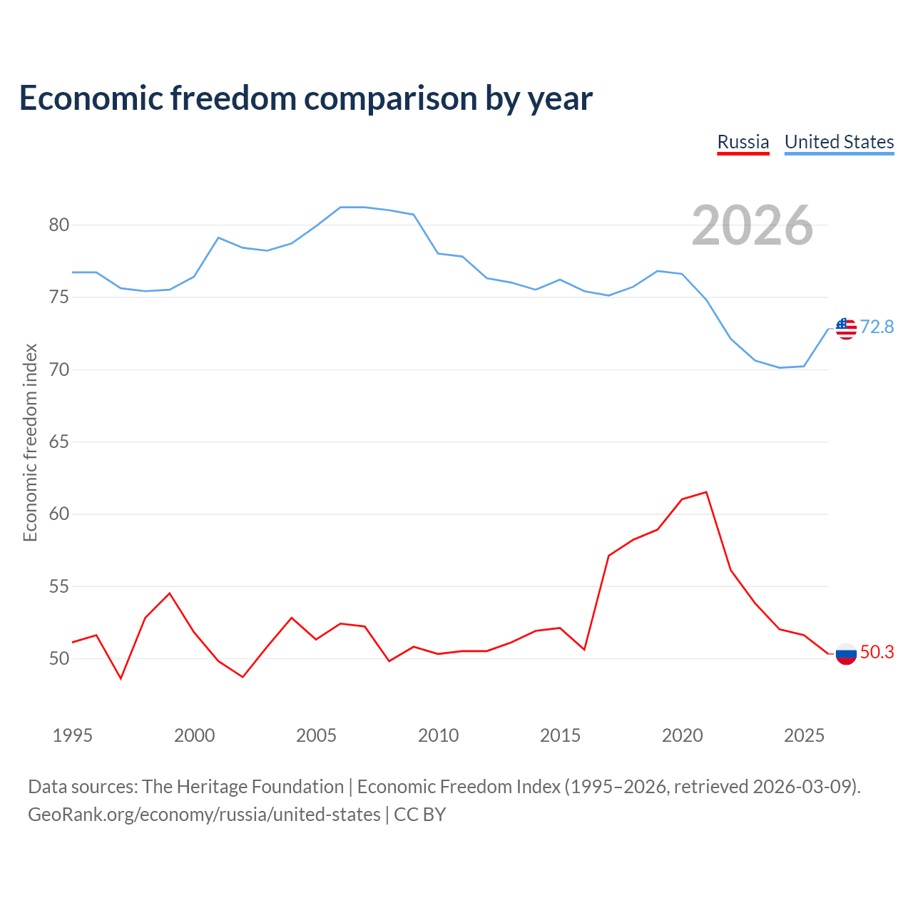 The Economic Freedom Index for Russia is 50.3, ranking 161/197, compared to 72.8 for the United States, ranking 27/197. The chart above displays a comparison of annual changes in economic freedom indexes.