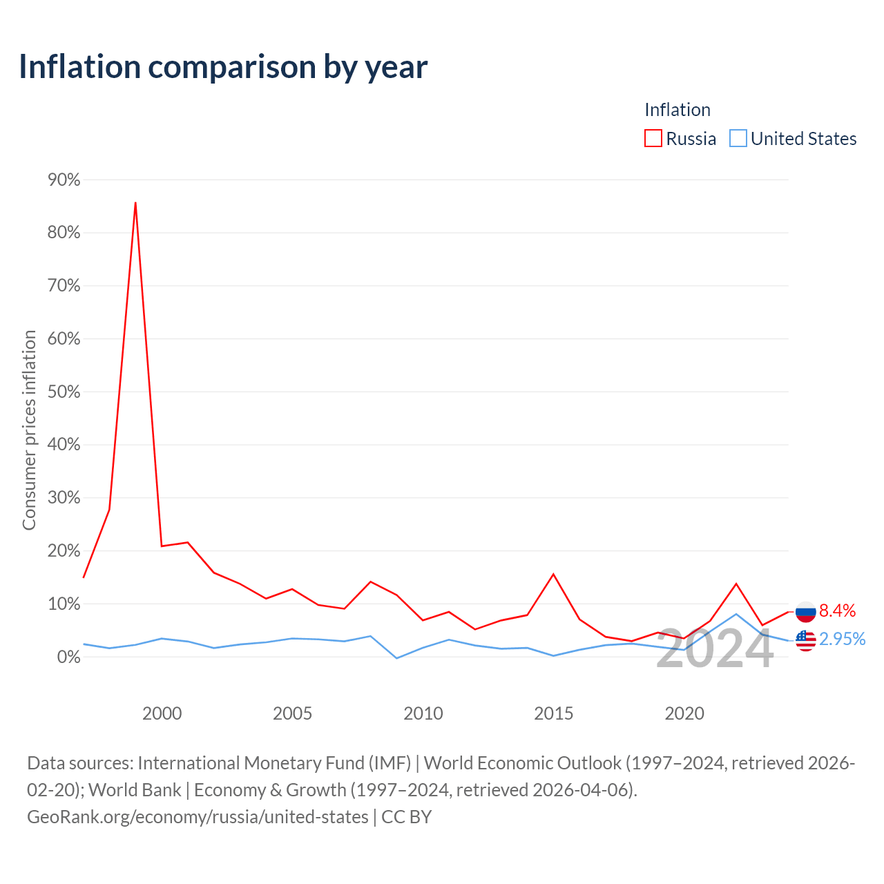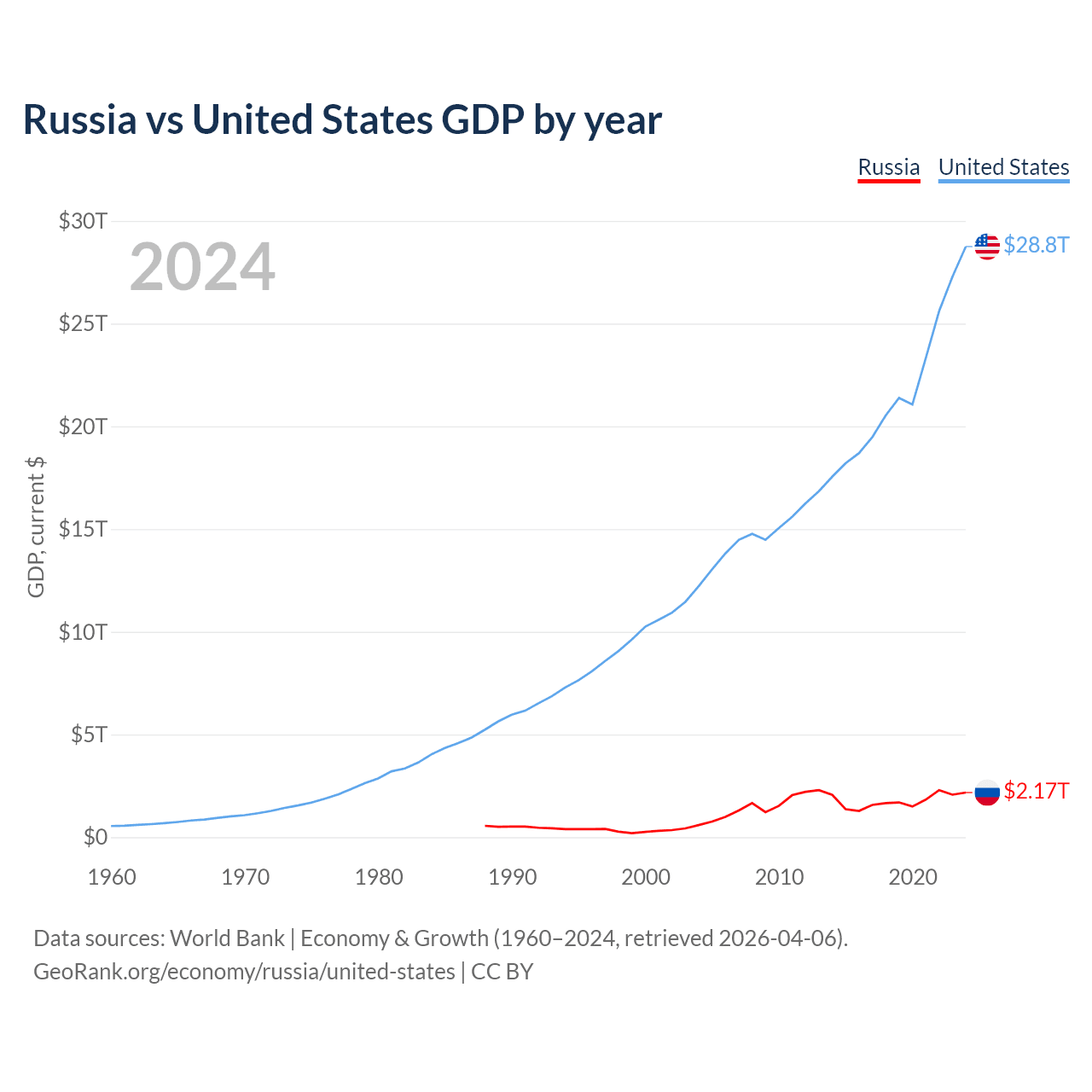 Russia has a GDP of $2.17T compared to $28.8T for the United States, ranking 11/197 and 1/197 by economy size, respectively.