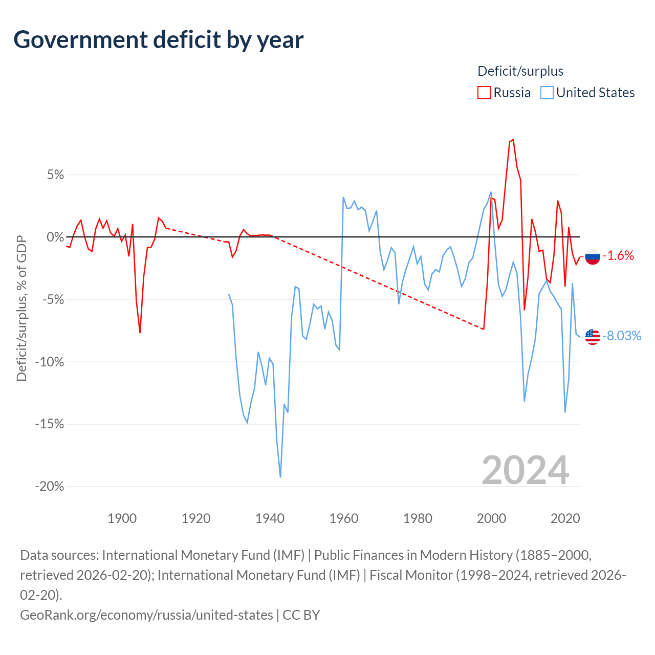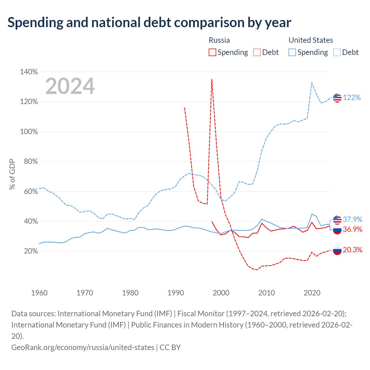 Russia has $440B in government debt (20.3% of GDP), compared to $35.2T (122.3% of GDP) in the United States.