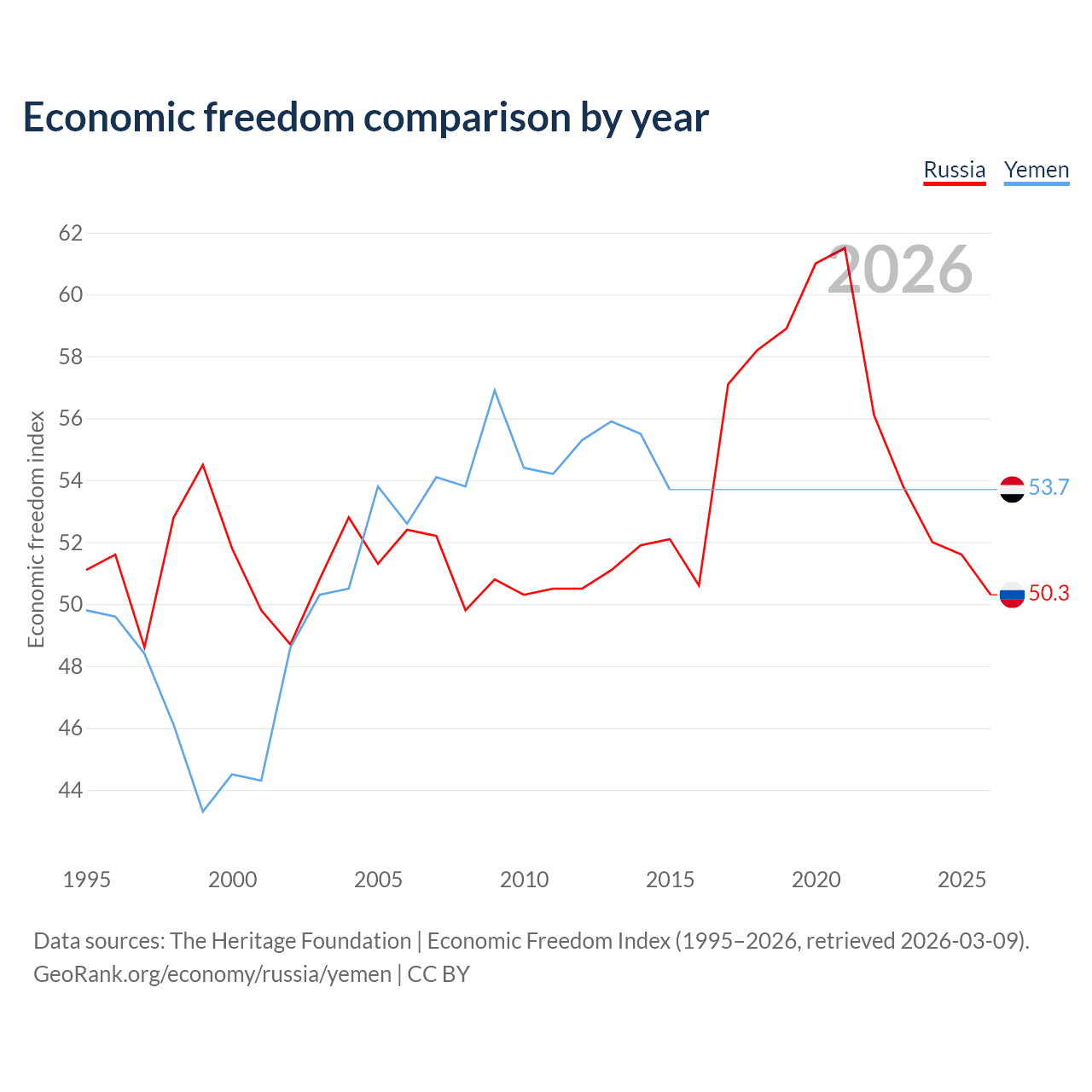 The Economic Freedom Index for Russia is 50.3, ranking 161/197, compared to 53.7 for Yemen, ranking 138/197. The chart above displays a comparison of annual changes in economic freedom indexes.