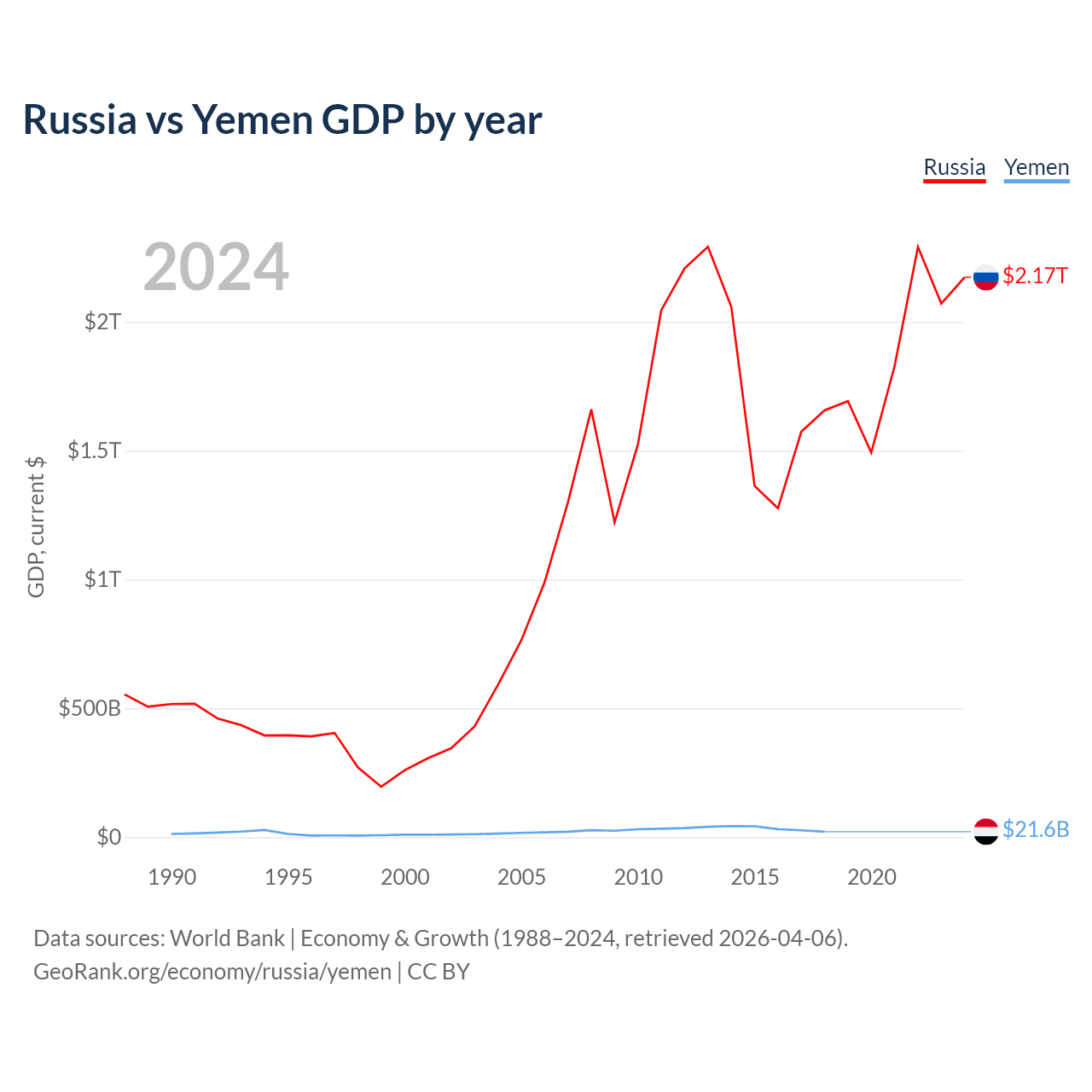 Russia has a GDP of $2.17T compared to $21.6B for Yemen, ranking 11/197 and 125/197 by economy size, respectively.
