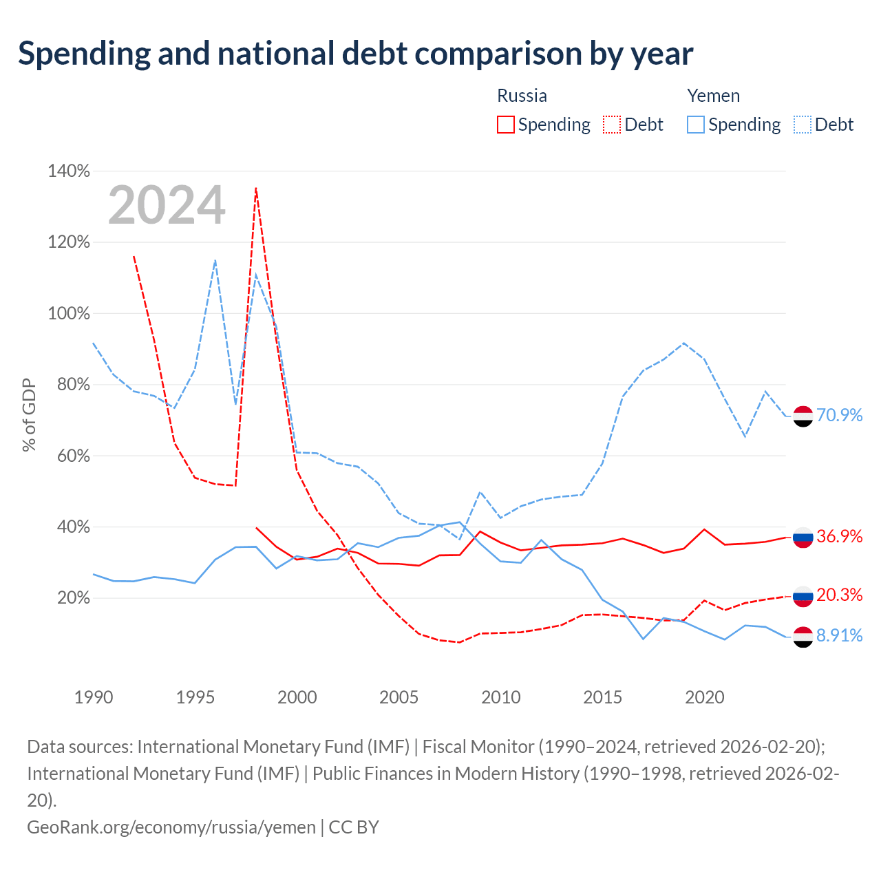 Russia has $440B in government debt (20.3% of GDP), compared to $18.8B (70.9% of GDP) in Yemen.