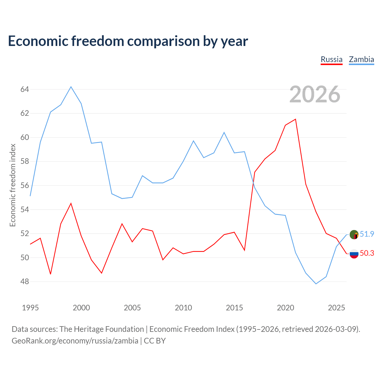 The Economic Freedom Index for Russia is 50.3, ranking 161/197, compared to 51.9 for Zambia, ranking 152/197. The chart above displays a comparison of annual changes in economic freedom indexes.