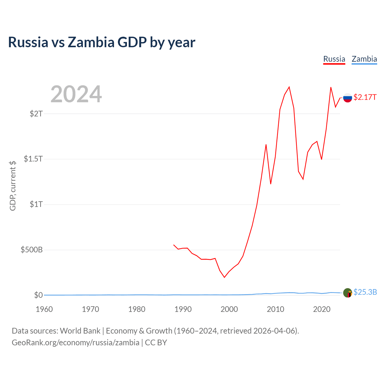 Russia vs Zambia GDP by year