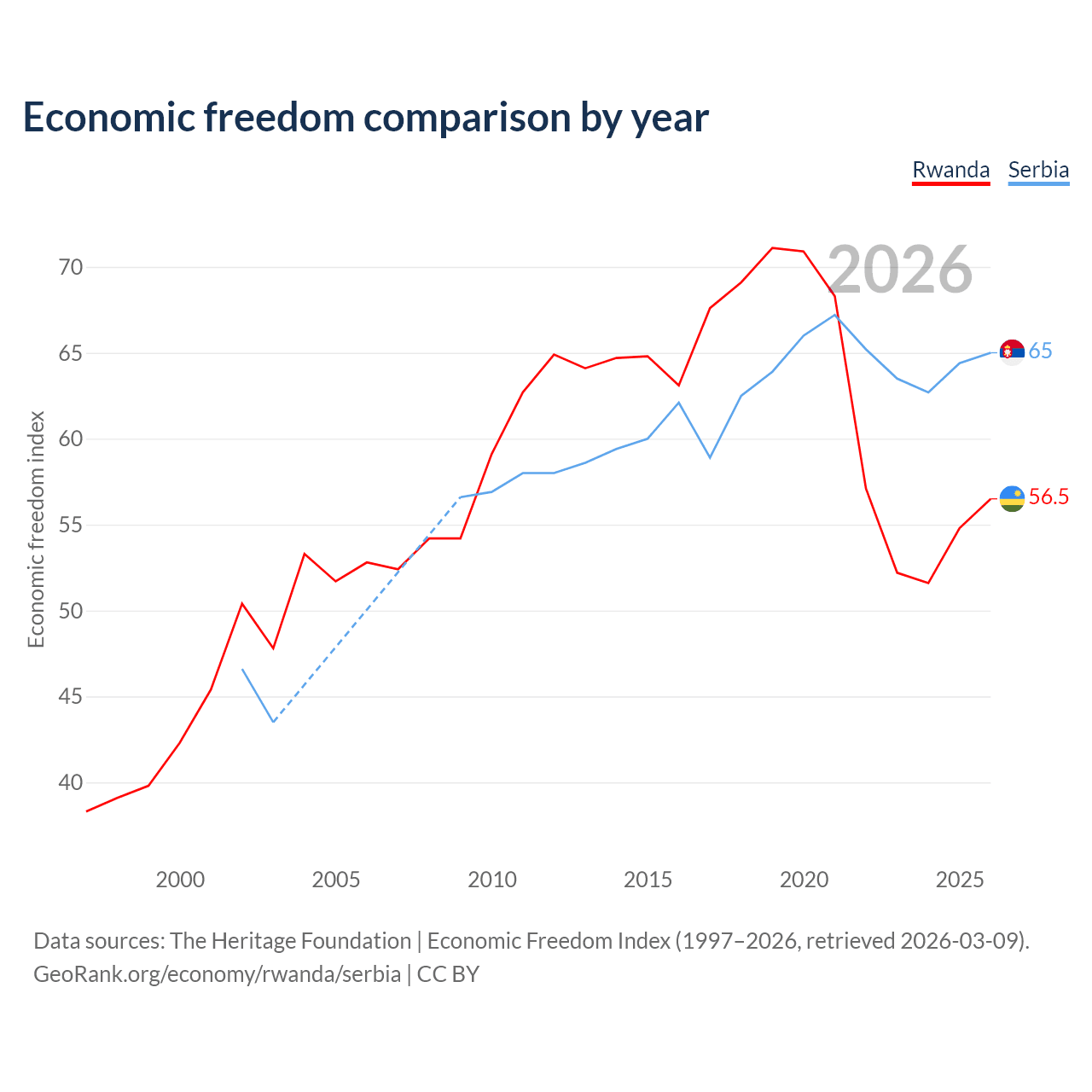 The Economic Freedom Index for Rwanda is 56.5, ranking 121/197, compared to 65 for Serbia, ranking 68/197. The chart above displays a comparison of annual changes in economic freedom indexes.