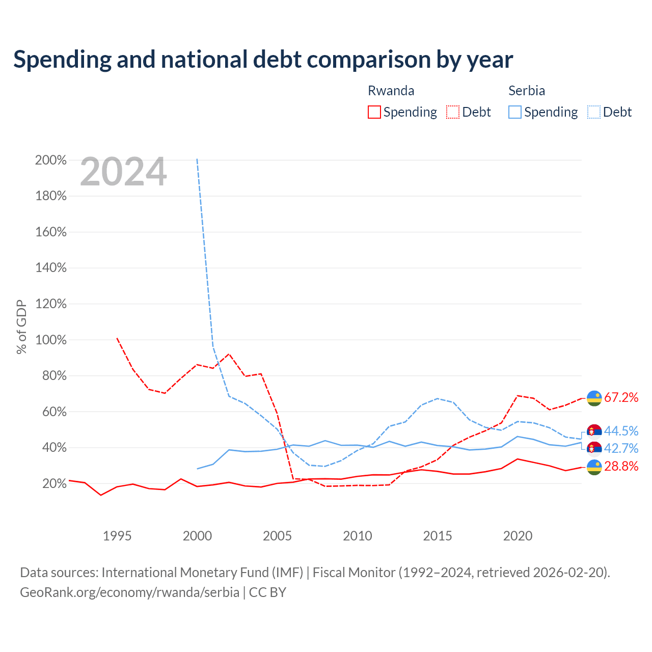 Rwanda has $9.58B in government debt (67.2% of GDP), compared to $40.1B (44.5% of GDP) in Serbia.