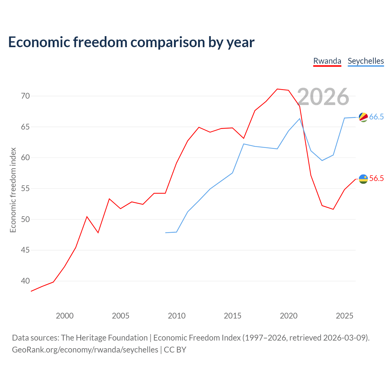 The Economic Freedom Index for Rwanda is 56.5, ranking 121/197, compared to 66.5 for the Seychelles, ranking 60/197. The chart above displays a comparison of annual changes in economic freedom indexes.