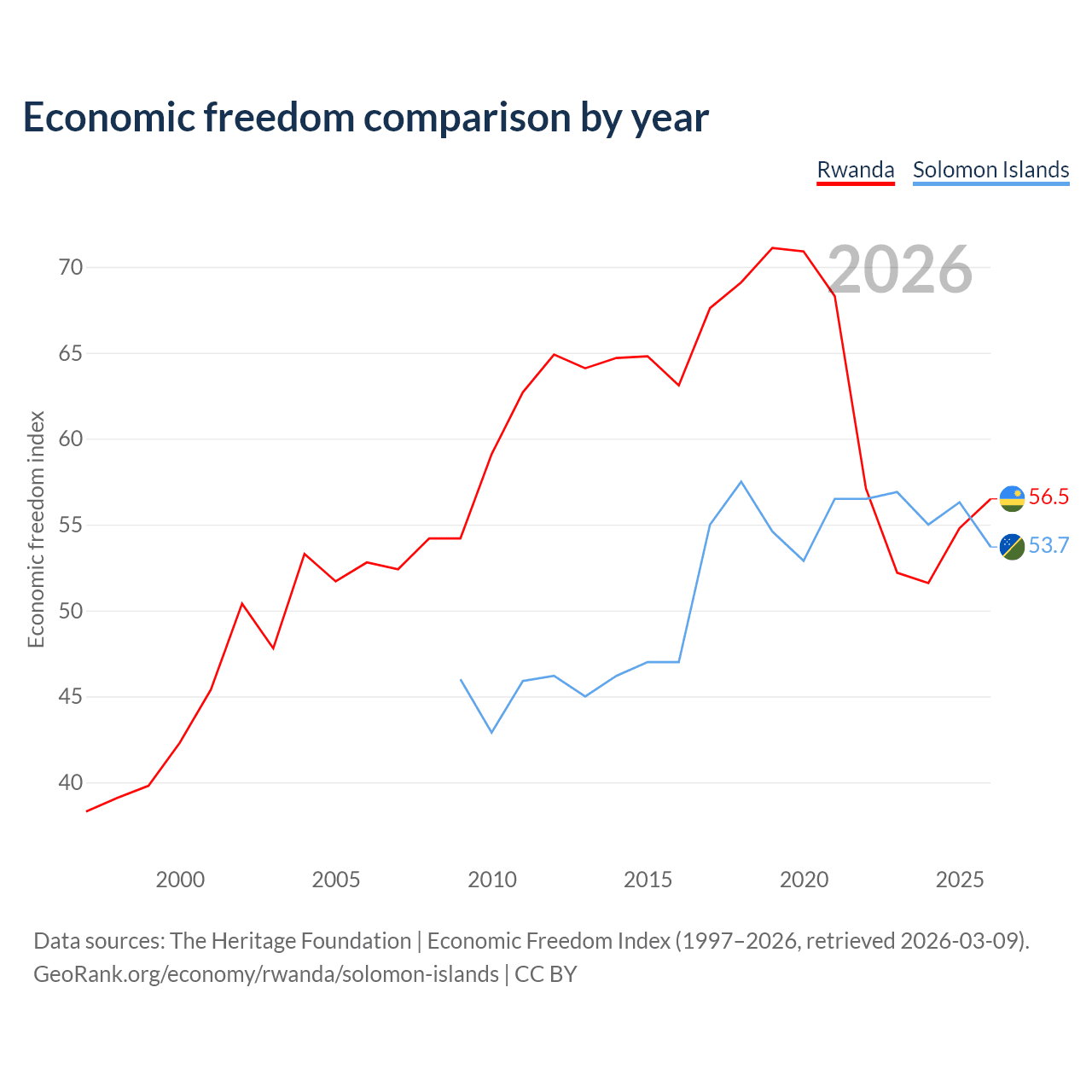 The Economic Freedom Index for Rwanda is 56.5, ranking 121/197, compared to 53.7 for the Solomon Islands, ranking 137/197. The chart above displays a comparison of annual changes in economic freedom indexes.