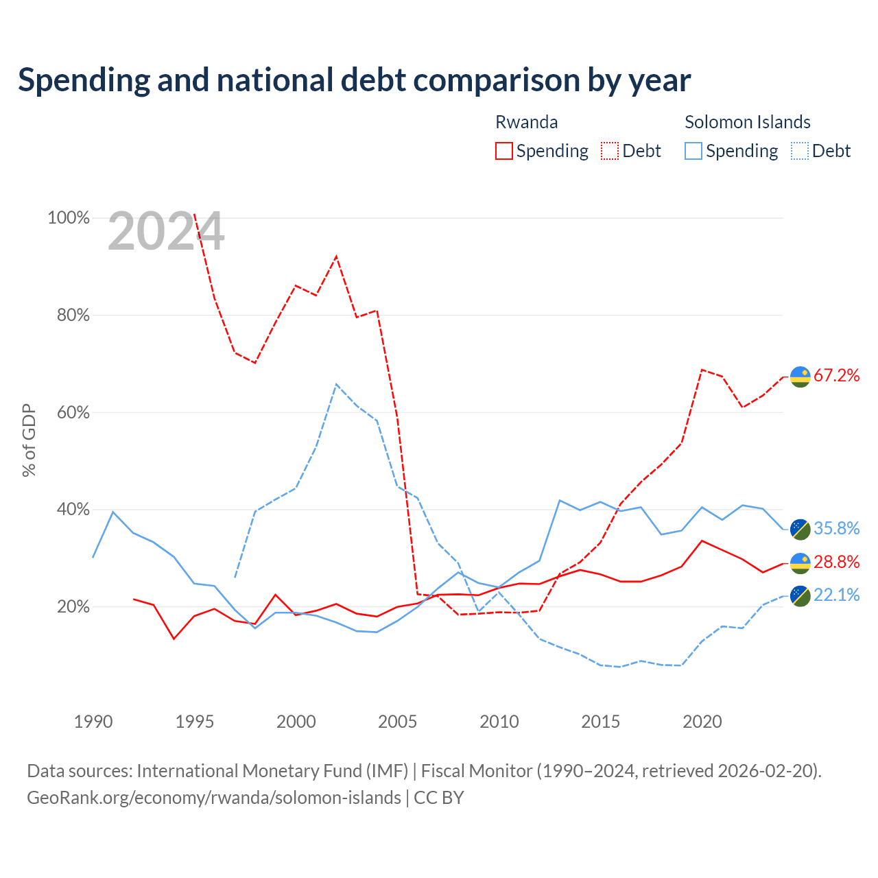 Rwanda has $9.58B in government debt (67.2% of GDP), compared to $350M (22.1% of GDP) in the Solomon Islands.