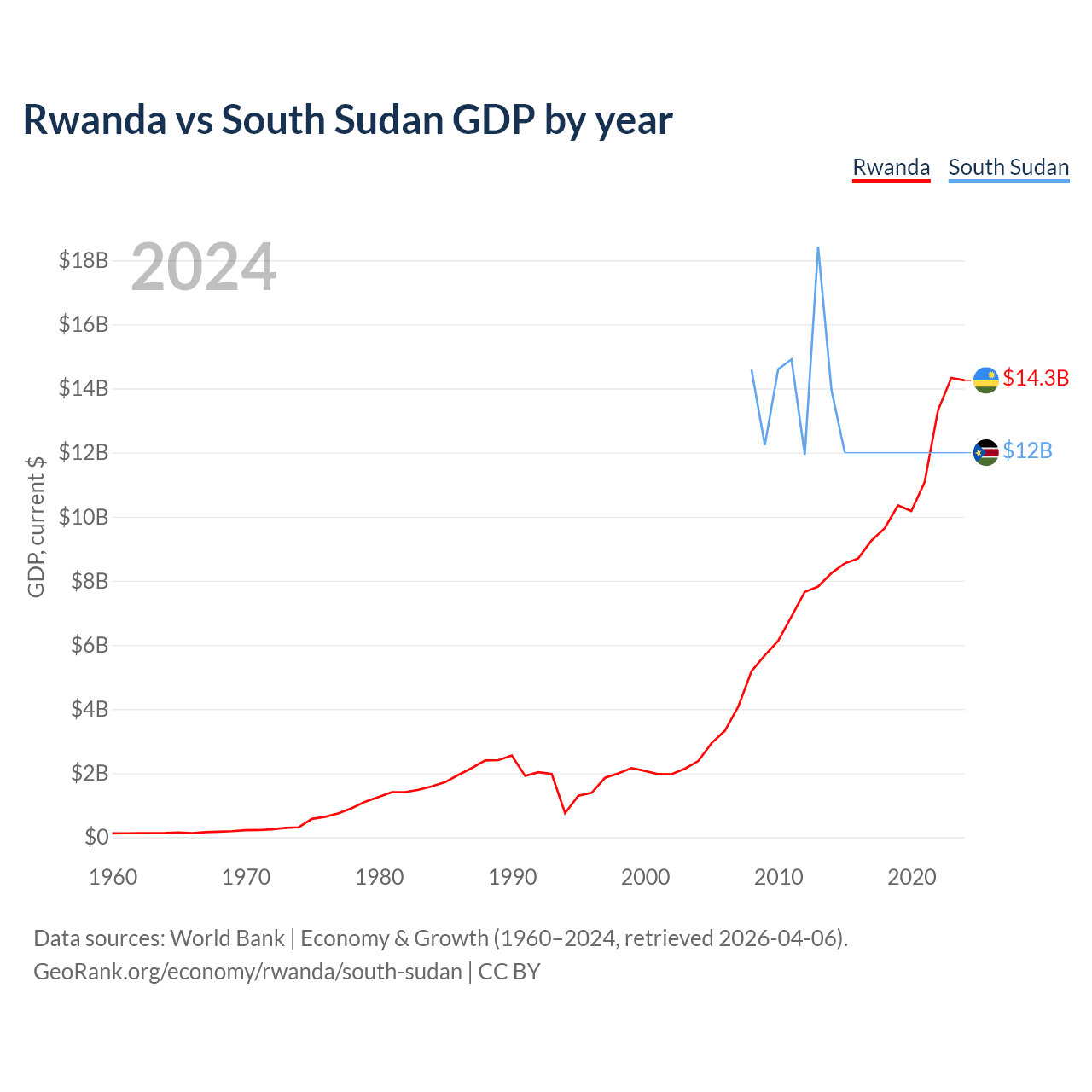 Rwanda has a GDP of $14.3B compared to $12B for South Sudan, ranking 144/197 and 149/197 by economy size, respectively.