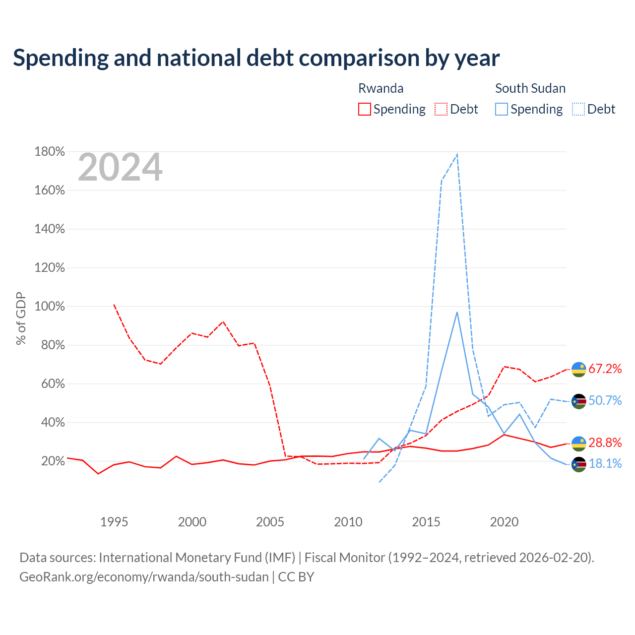 Rwanda has $9.58B in government debt (67.2% of GDP), compared to $7.04B (50.7% of GDP) in South Sudan.