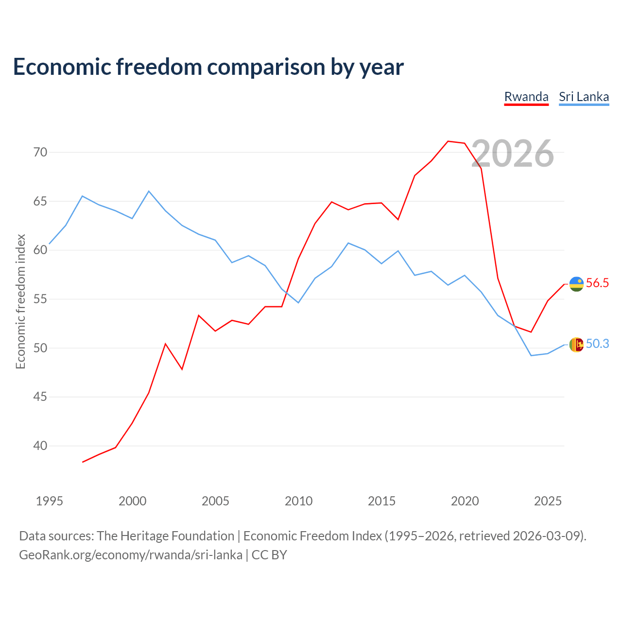 The Economic Freedom Index for Rwanda is 56.5, ranking 121/197, compared to 50.3 for Sri Lanka, ranking 162/197. The chart above displays a comparison of annual changes in economic freedom indexes.