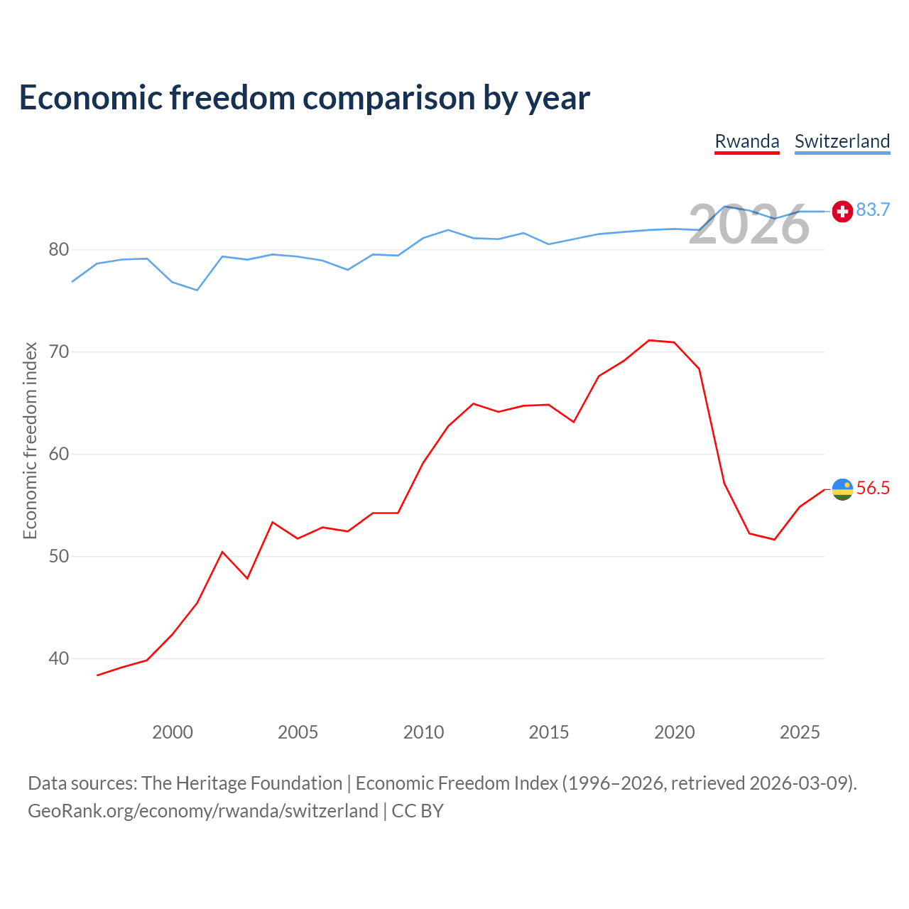 The Economic Freedom Index for Rwanda is 56.5, ranking 121/197, compared to 83.7 for Switzerland, ranking 2/197. The chart above displays a comparison of annual changes in economic freedom indexes.