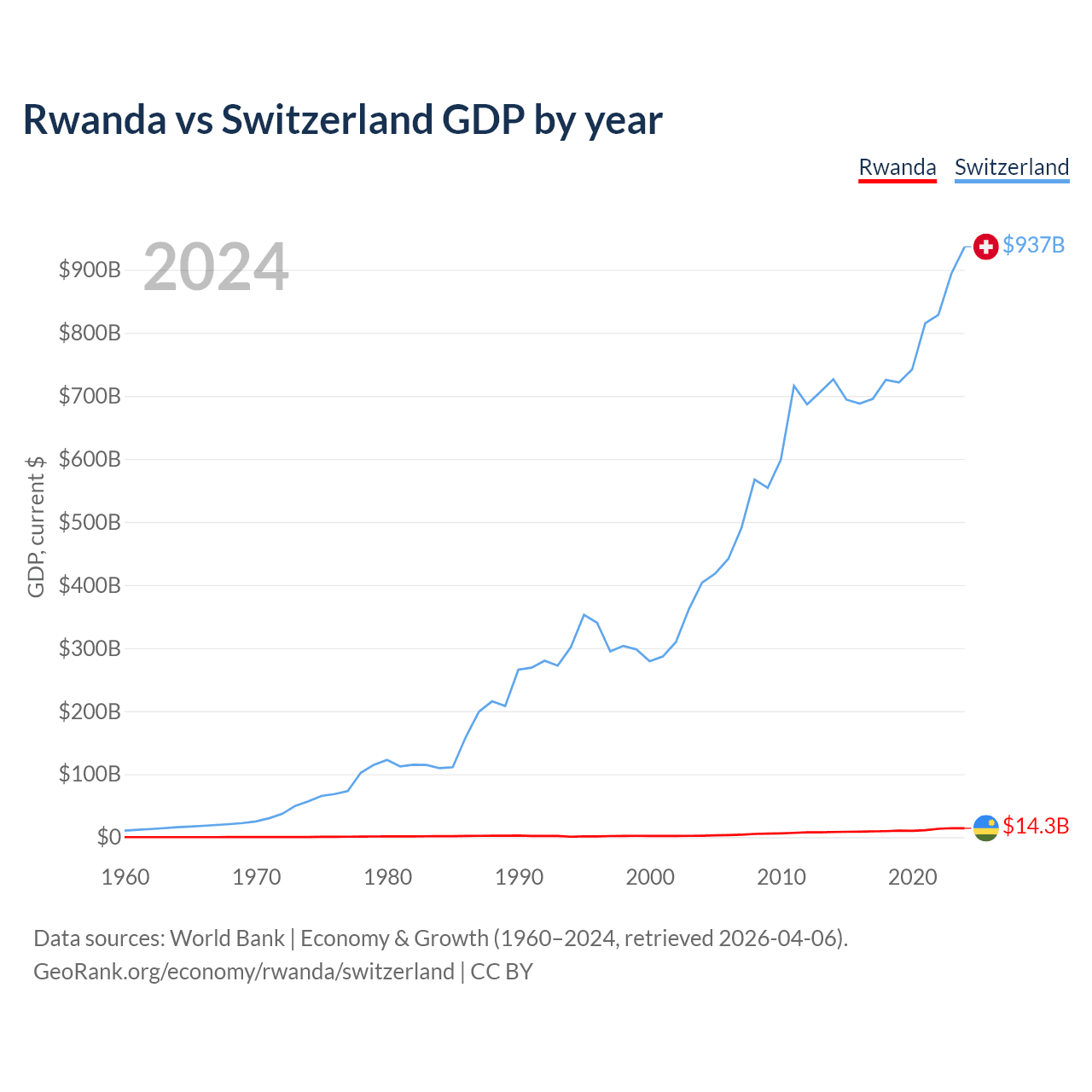 Rwanda has a GDP of $14.3B compared to $937B for Switzerland, ranking 144/197 and 20/197 by economy size, respectively.