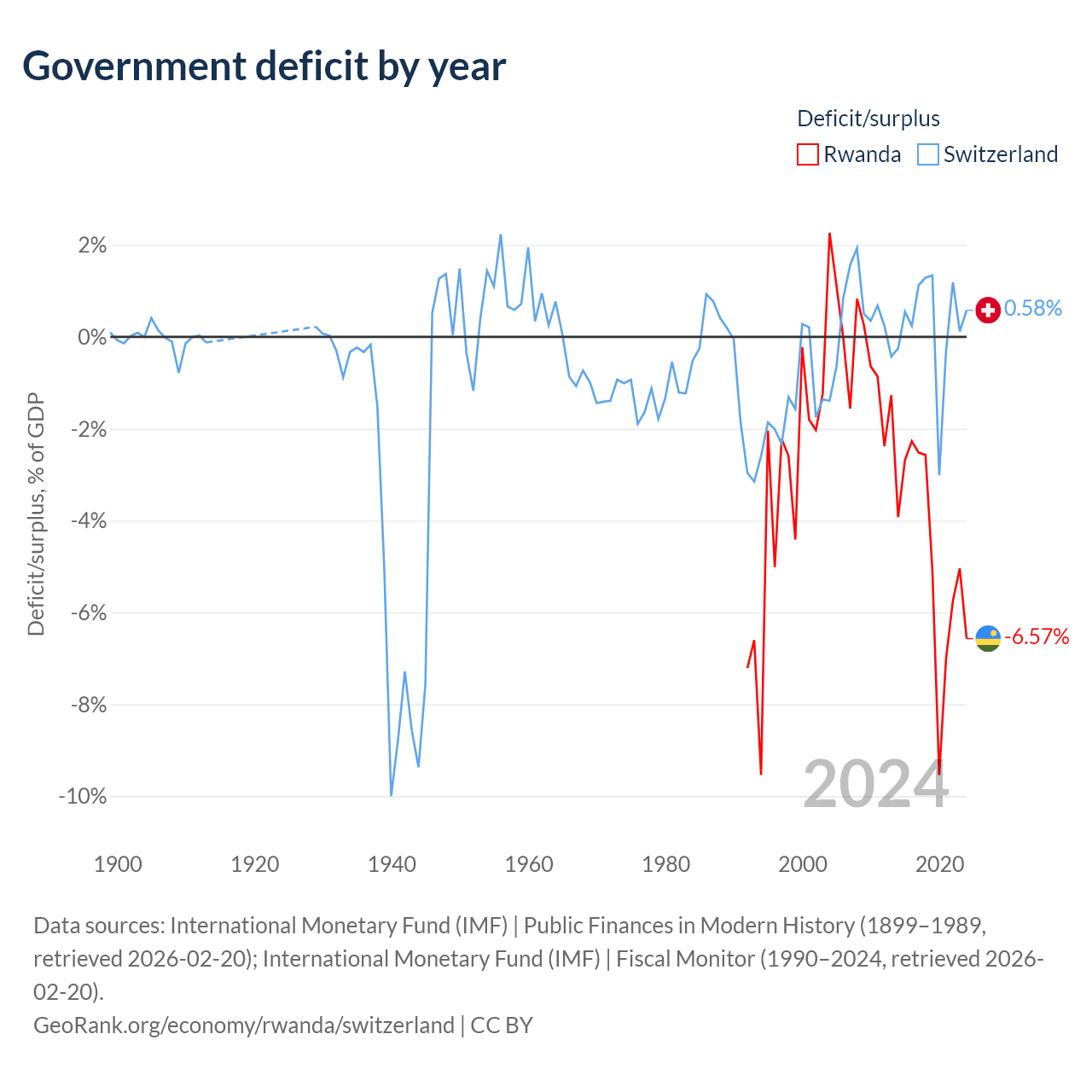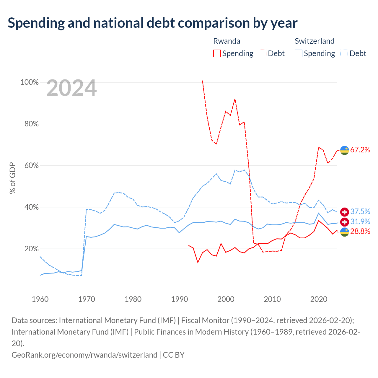Rwanda has $9.58B in government debt (67.2% of GDP), compared to $351B (37.5% of GDP) in Switzerland.