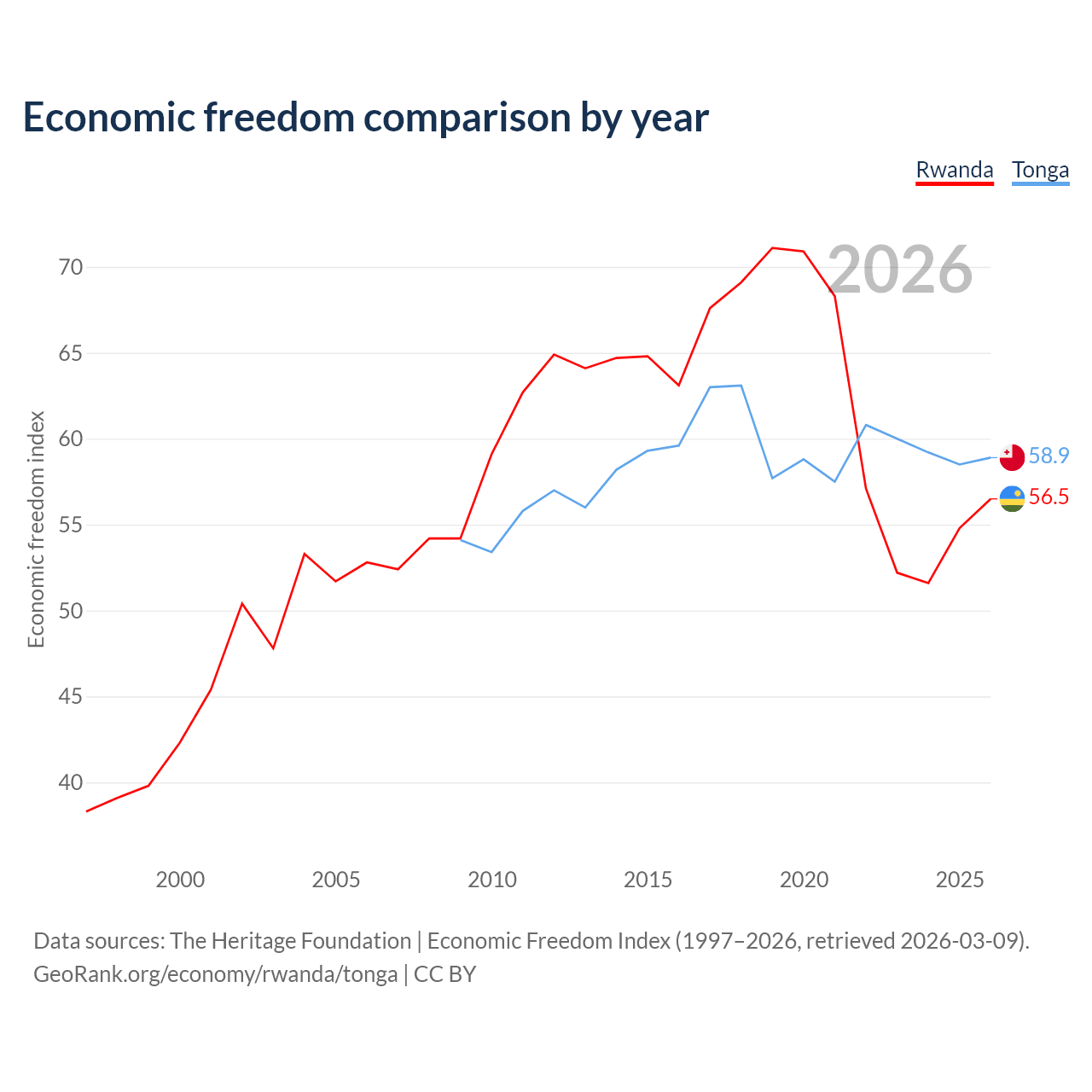 The Economic Freedom Index for Rwanda is 56.5, ranking 121/197, compared to 58.9 for Tonga, ranking 107/197. The chart above displays a comparison of annual changes in economic freedom indexes.