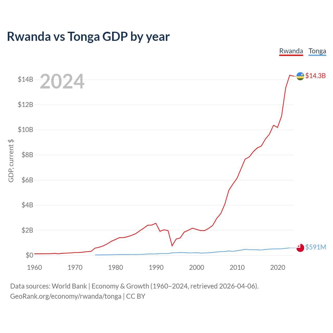 Rwanda has a GDP of $14.3B compared to $591M for Tonga, ranking 144/197 and 191/197 by economy size, respectively.